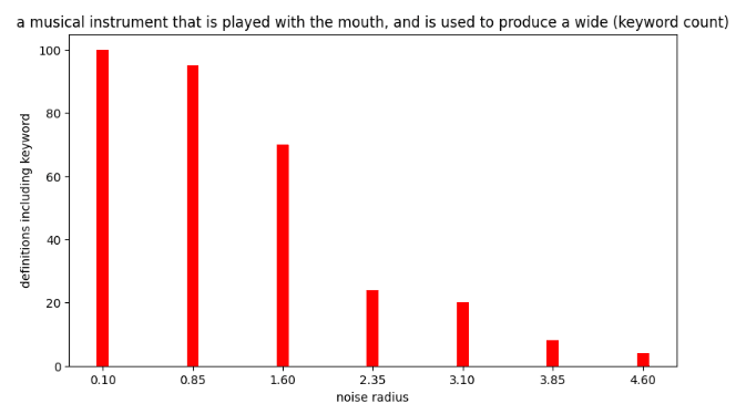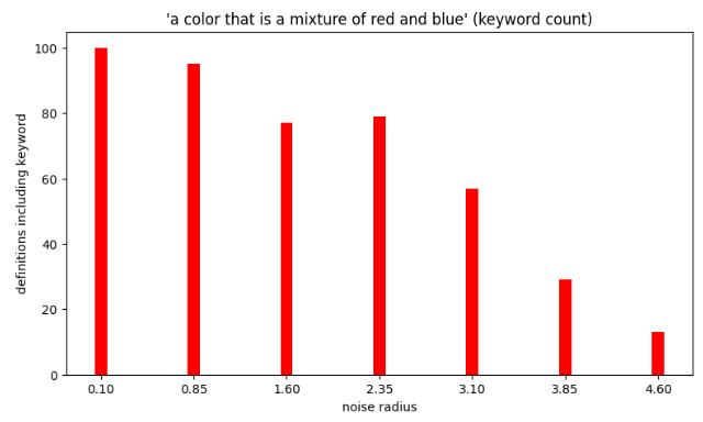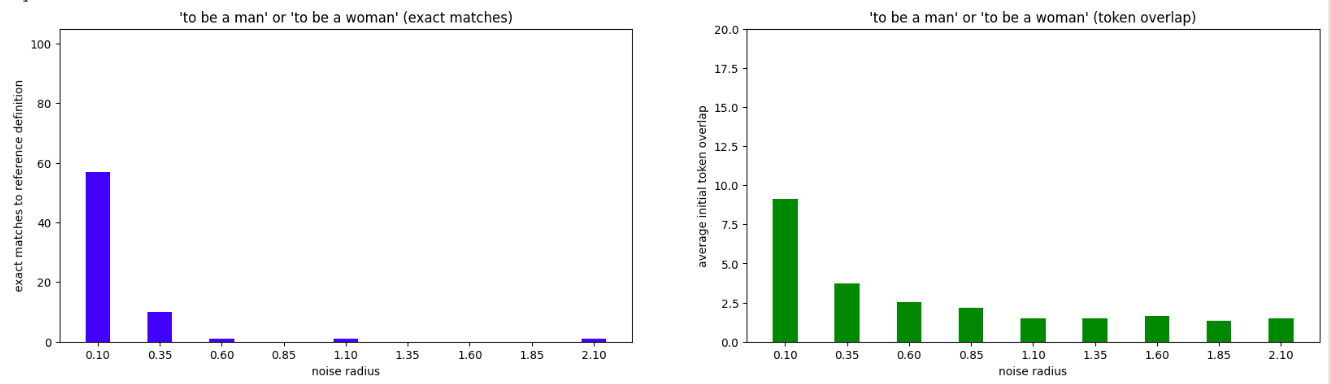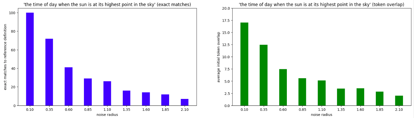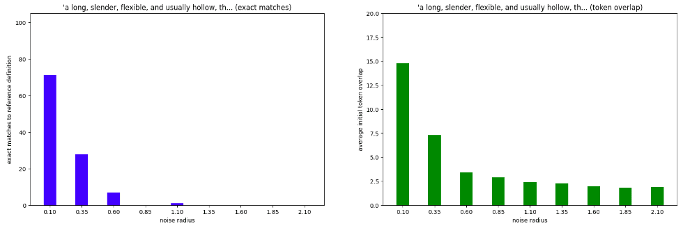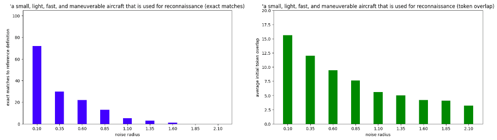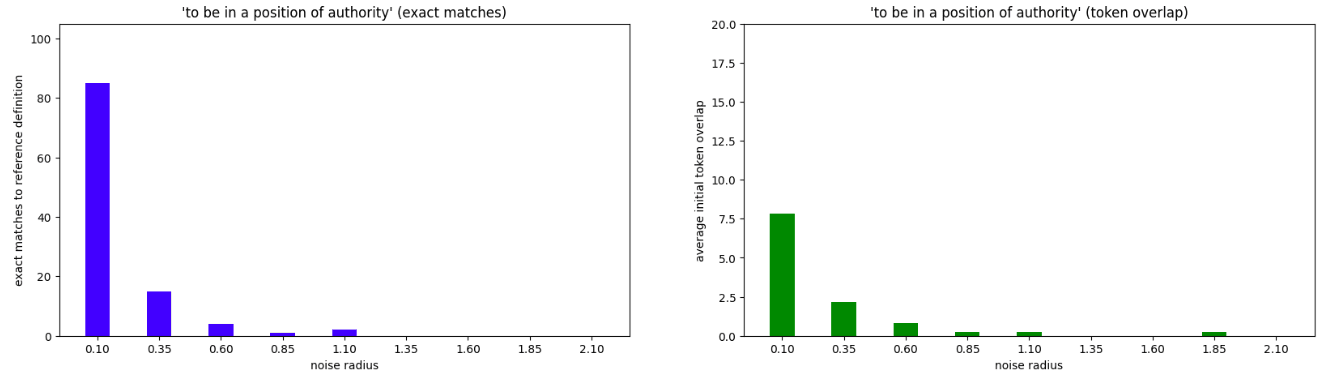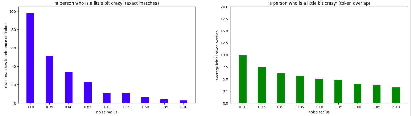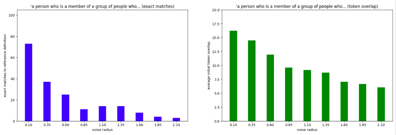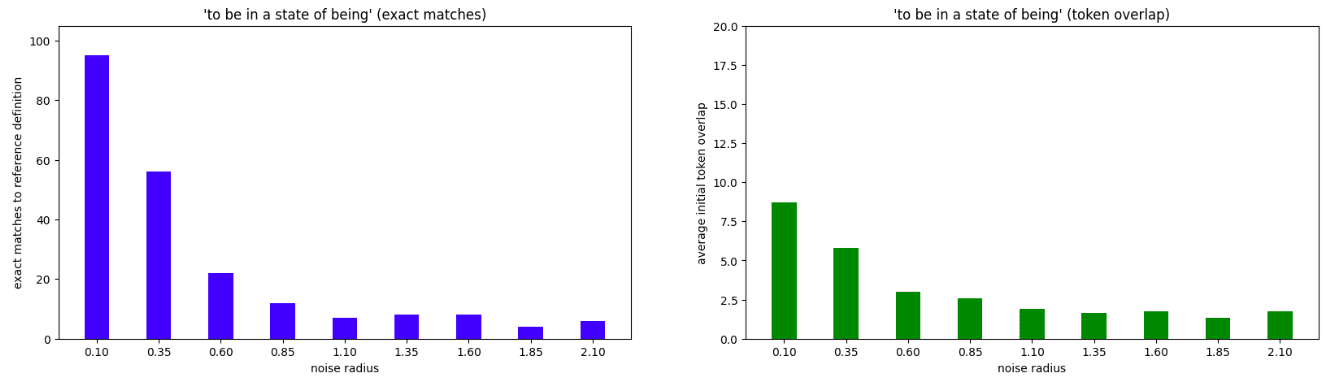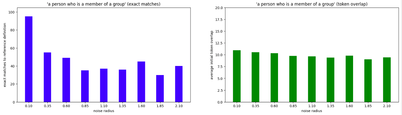 For each of the collected embeddings, 100 randomly directed noise vectors of each of the magnitudes [0.1, 0.35, 0.6, 0.85, 1.1, 1.35, 1.6, 1.85, 2.1] were sampled and added to it. Definitions were generated for each of these perturbations, which were then compared to the reference definition produced by the embedding in question.