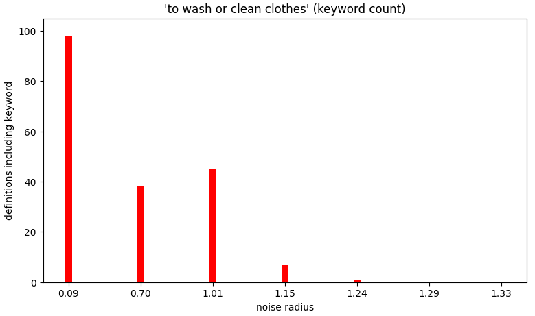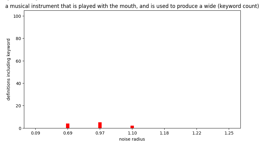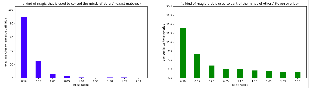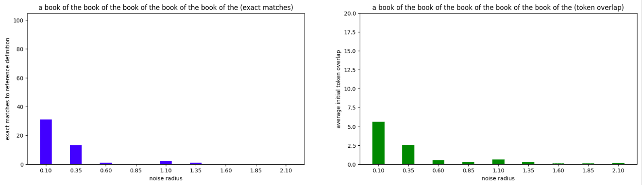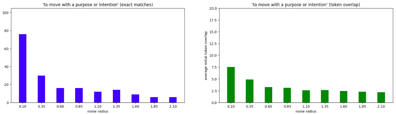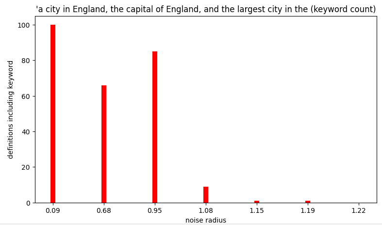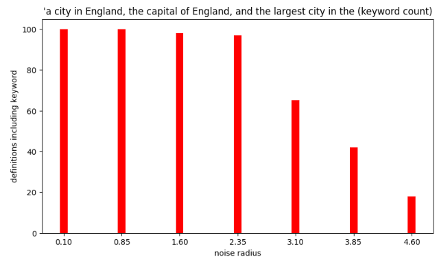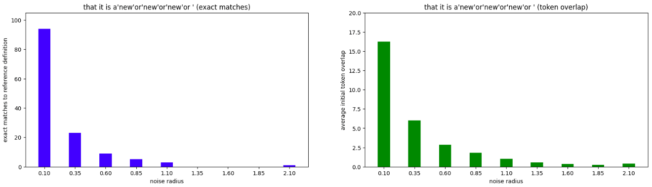 The mean radii for these normalised token perturbations are shown below the bars in the charts below. Notice how there’s almost no trace of the original definition once we’re more than a distance of 1 from the token embedding if (as we are here) we constrain our attention to the centroid-centred hypersphere it lives on. Before introducing this normalisation, we were seeing traces of definitions persisting out to distances > 4.6 from their token embeddings.