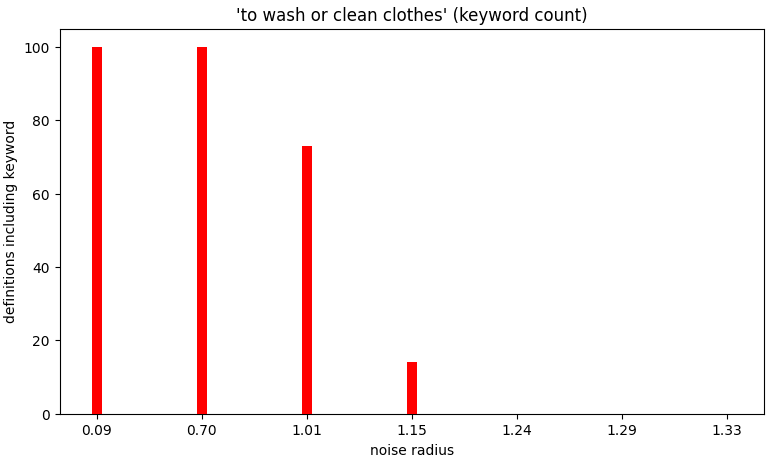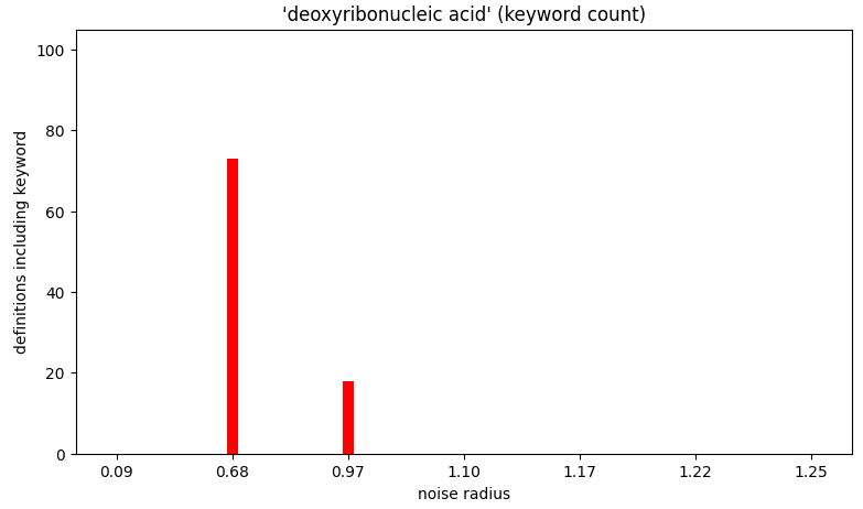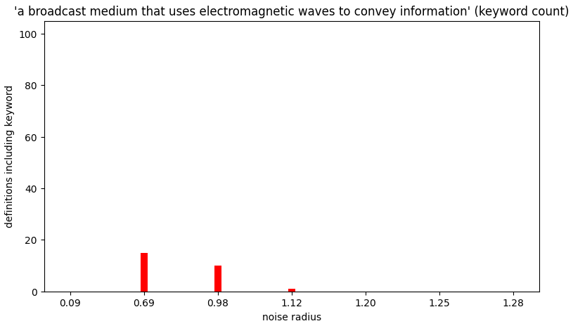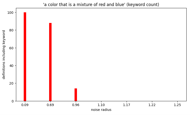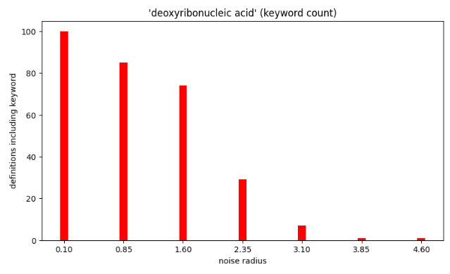 Because I was seeing a lot of definitions immediately straying from the reference embedding definition in terms of exact wording, but still remaining “on topic”, I also experimented with a third metric which involved choosing a keystring from the original definition and recording how many of the 100 definition outputs include this. The basic decay pattern was always the same.