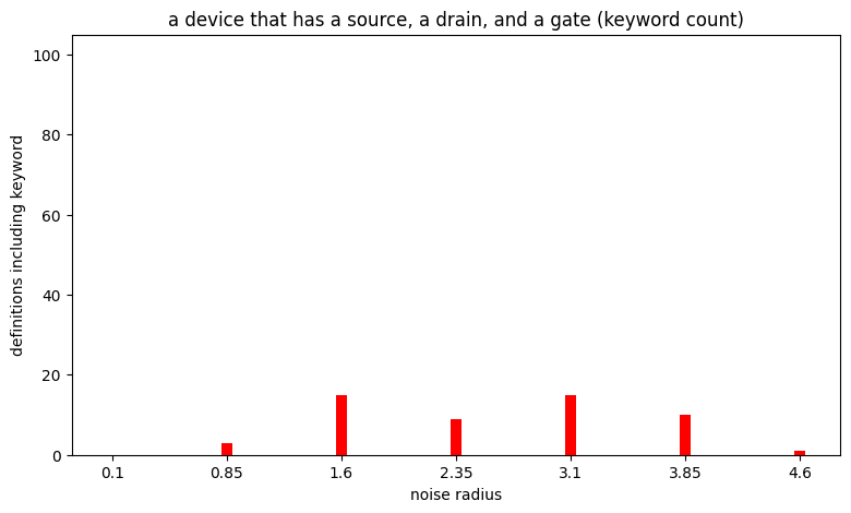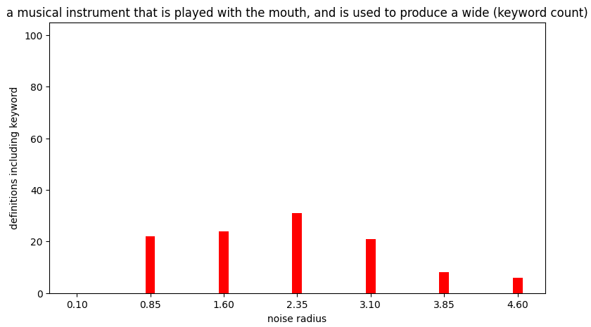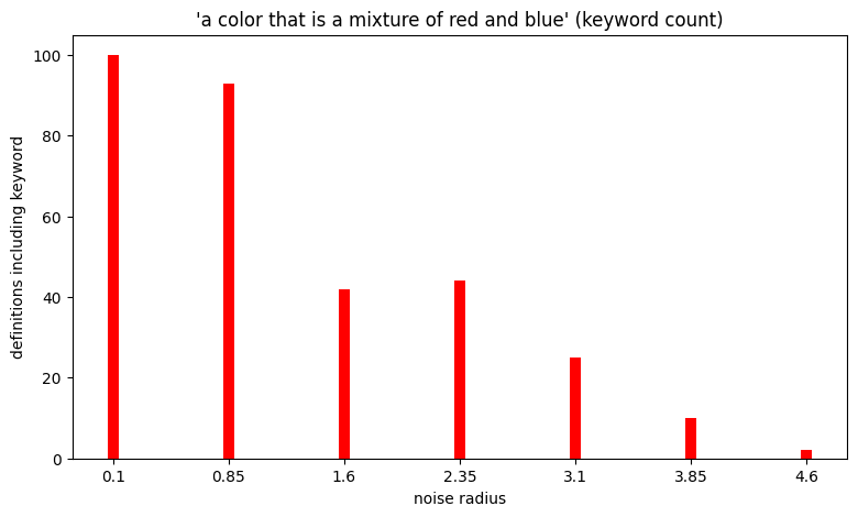 These bar charts show how often certain obvious keystrings appear in the 100 definitions produced for embedding vectors sampled at the various distances from the token embedding in question. Note the similar decay curves across many examples (all ten sets of charts are given in Appendix A). Also note the way that circular definitions (which include the token string itself, as illustrated in the lower-right panels) start to emerge, then peak, then fade in a similar way across examples: