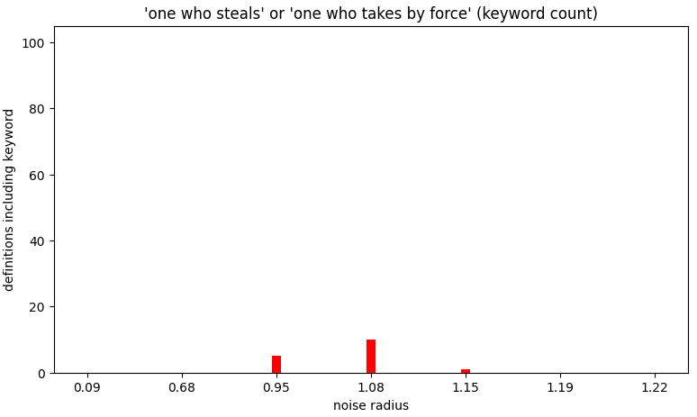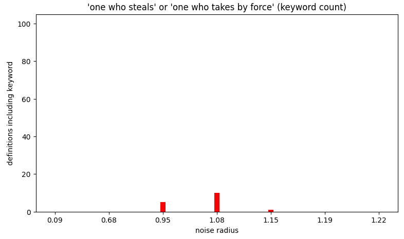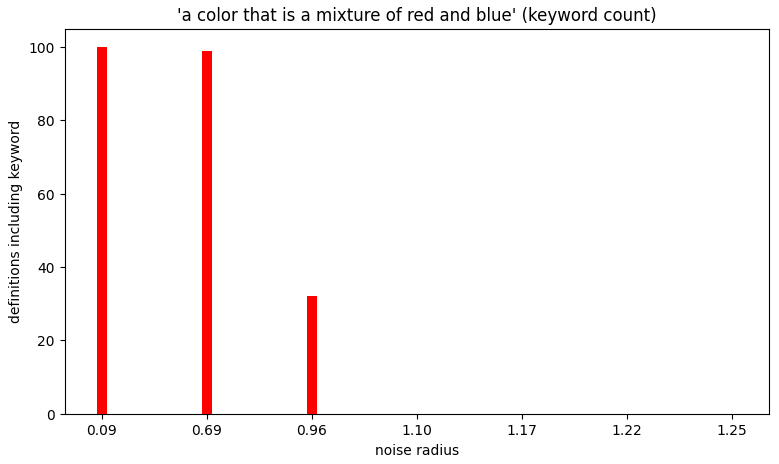 The original post focussed on distributions of various definitional themes across the scale of “distance from centroid”, providing numerous bar charts like those seen immediately below. At a set of fixed radial distances from the centroid (mean token embedding), 100 non-token embeddings (“nokens” or “ghost tokens”) were randomly sampled. For each, GPT-J was prompted with
