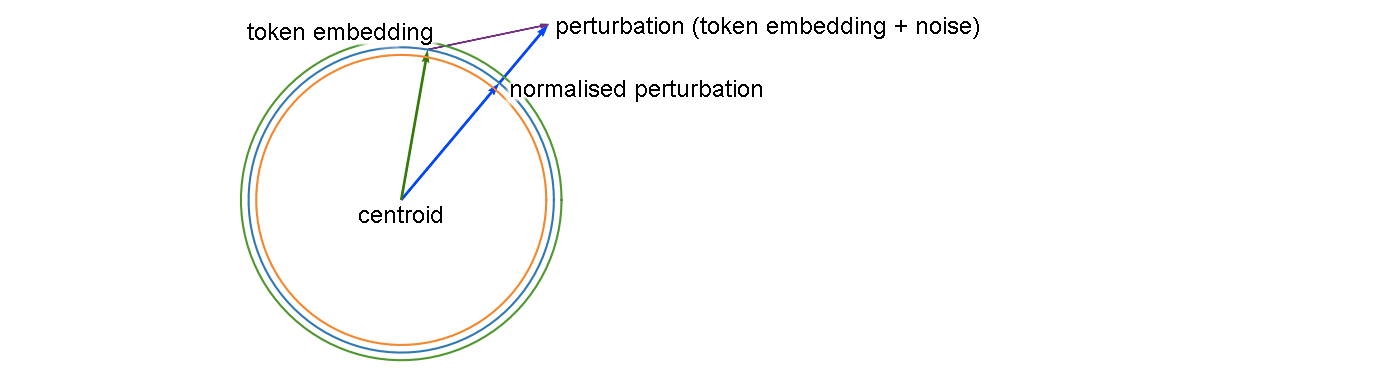 Here we add the randomly directed noise vectors of the specified magnitudes to our token embedding, but then (i) subtract the centroid vector from the results, (ii) rescale to match the token embedding’s distance-from-centroid (which will be ~1) and then (iii) add back the centroid vector. In this way, we get something at the same distance from centroid as the original token embedding.