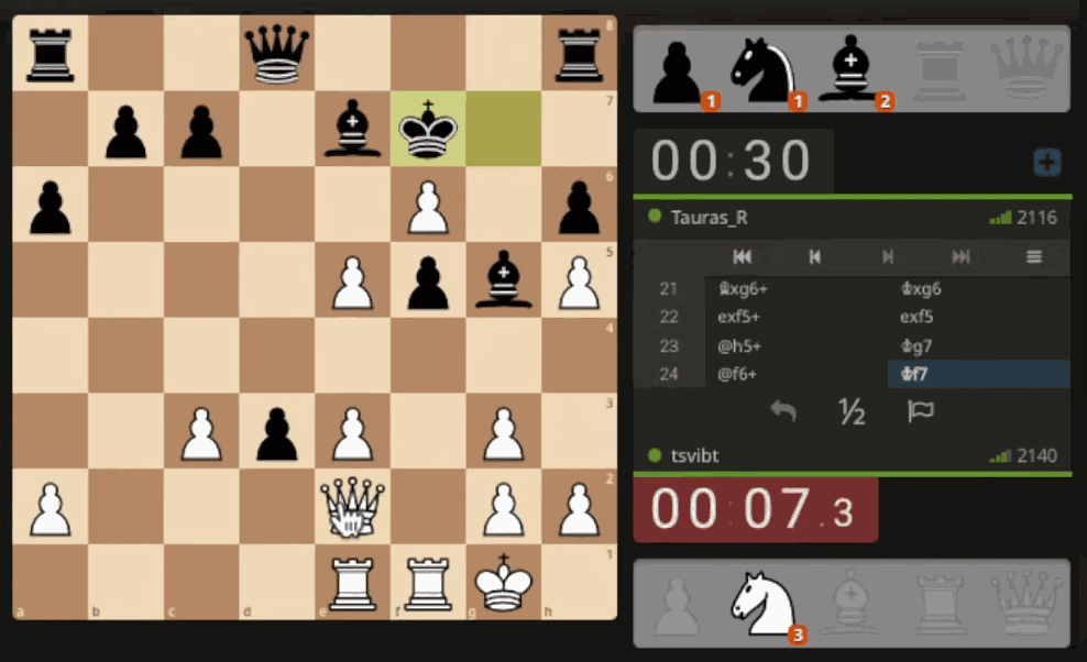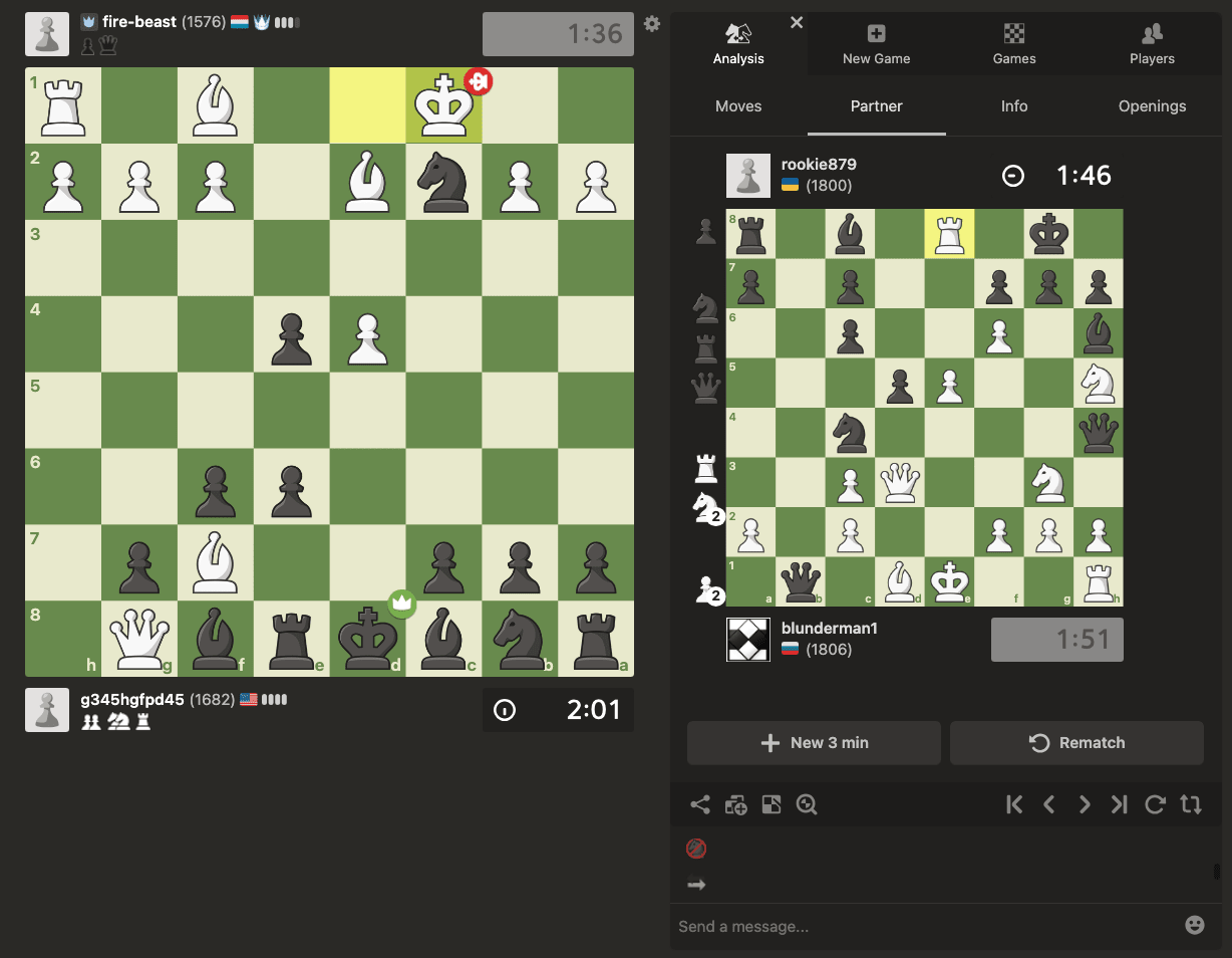 Bughouse also makes you very interdependent with your teammate. For one thing, if they lose, you lose. But it’s much more than that. Every little decision they make can derail your whole position on your board, and vice versa; even them taking 3 seconds longer on a move can put you in a much tougher spot.