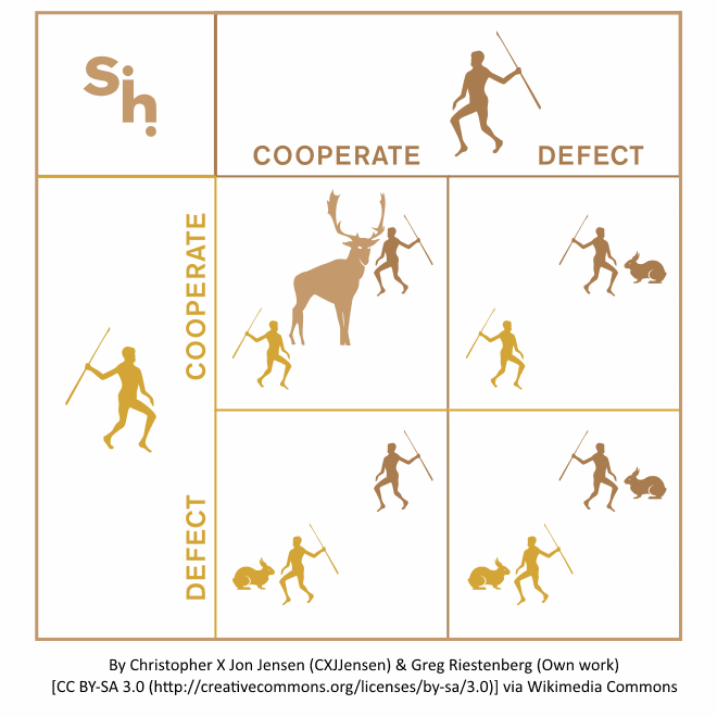 The Stag Hunt is an abstract game, like the Prisoner’s Dilemma, that serves as a simplified model for many real-life situations. In the Stag Hunt, each hunter can choose to hunt Stag or Hare. If they both hunt Stag, they’re successful and they both get a lot of food. If someone hunts Hare, he’ll get a Hare, which is a bit of food. But, if one of them hunts Stag while the other hunts Hare, the Stag hunter gets nothing: