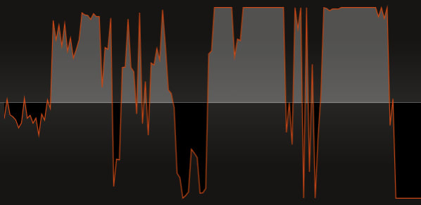 In Crazyhouse, this sort of chain reaction is common, where you attack using pieces you took during the attack. It’s also common that an apparently safe King gets suddenly pried loose from his protective fortress and subjected to mortal threats. This makes games swingy. Very swingy. For Crazyhouse games, the computer evaluation bar, which says who is winning at each point in the game [[1]] , not uncommonly looks like this: