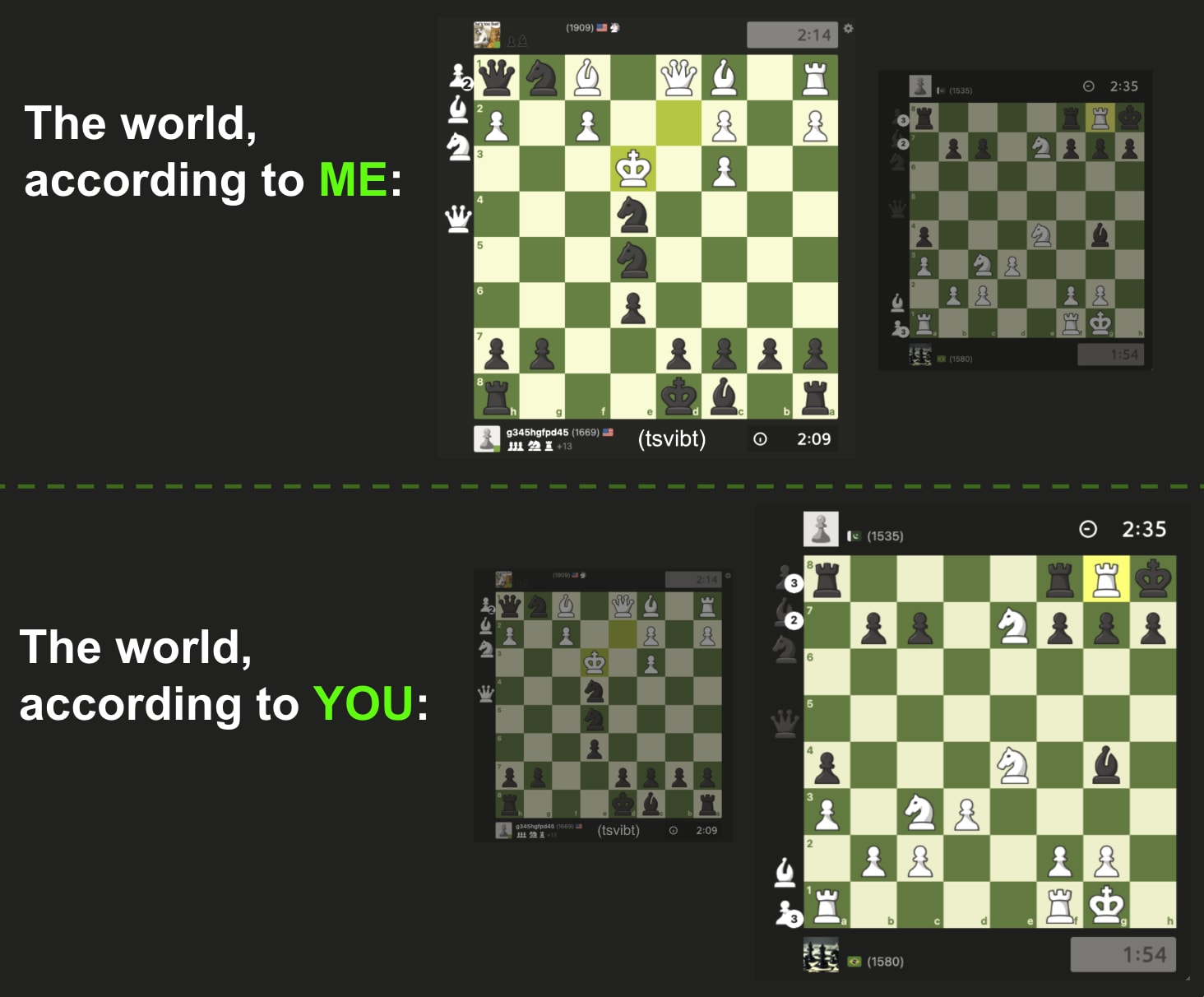 The Bughouse Effect is a perfect application for symmetrization. That’s where you’re angry at someone for their behavior, but then you think of times you’ve done basically that exact same behavior in an analogous position. You can ask: When I was in a time crunch, was I paying close attention my teammate’s board, so that I avoid losing a piece that would be dangerous in my teammate’s opponent’s hands? When I was asked to not lose a Knight, did I immediately see that, or did it take me a few seconds to see the message, and by then I’d already traded a Knight?