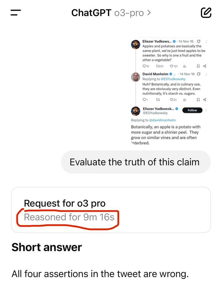 McKay Wrigley: My last 4 o3 Pro requests in ChatGPT… It thought for: – 26m 10s – 23m 45s – 19m 6s – 21m 18s Absolute *powerhouse* of a model.