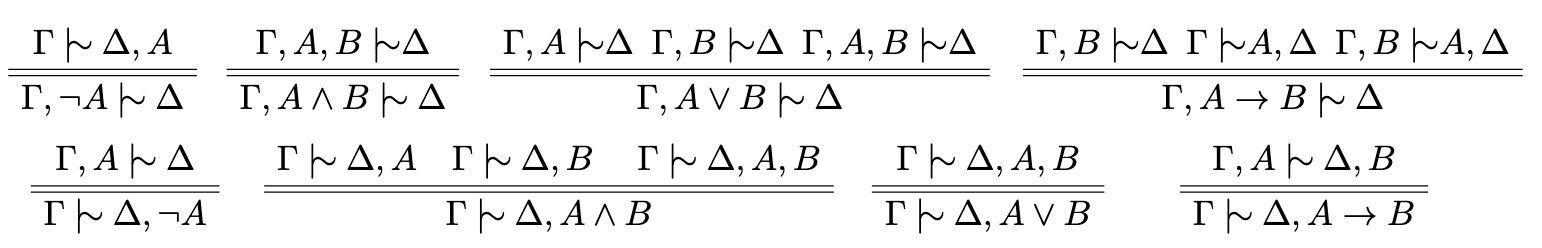 Note: each cell in this table corresponds directly to a sequent rule further above, where combination of sentences within a sequent corresponds to , and multiple sequents are combined via .