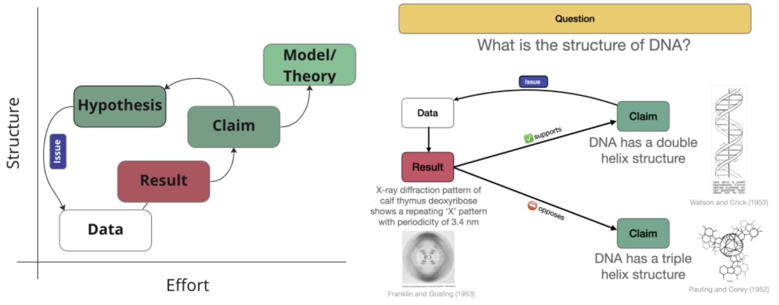 Somewhere in between these extremes lies discourse graphs: these are representations which fix an ontology for discourse that includes claims, data, hypotheses, results, support, opposition. However, the content of these claims is expressed in natural language, preventing any reliable mechanized analysis.