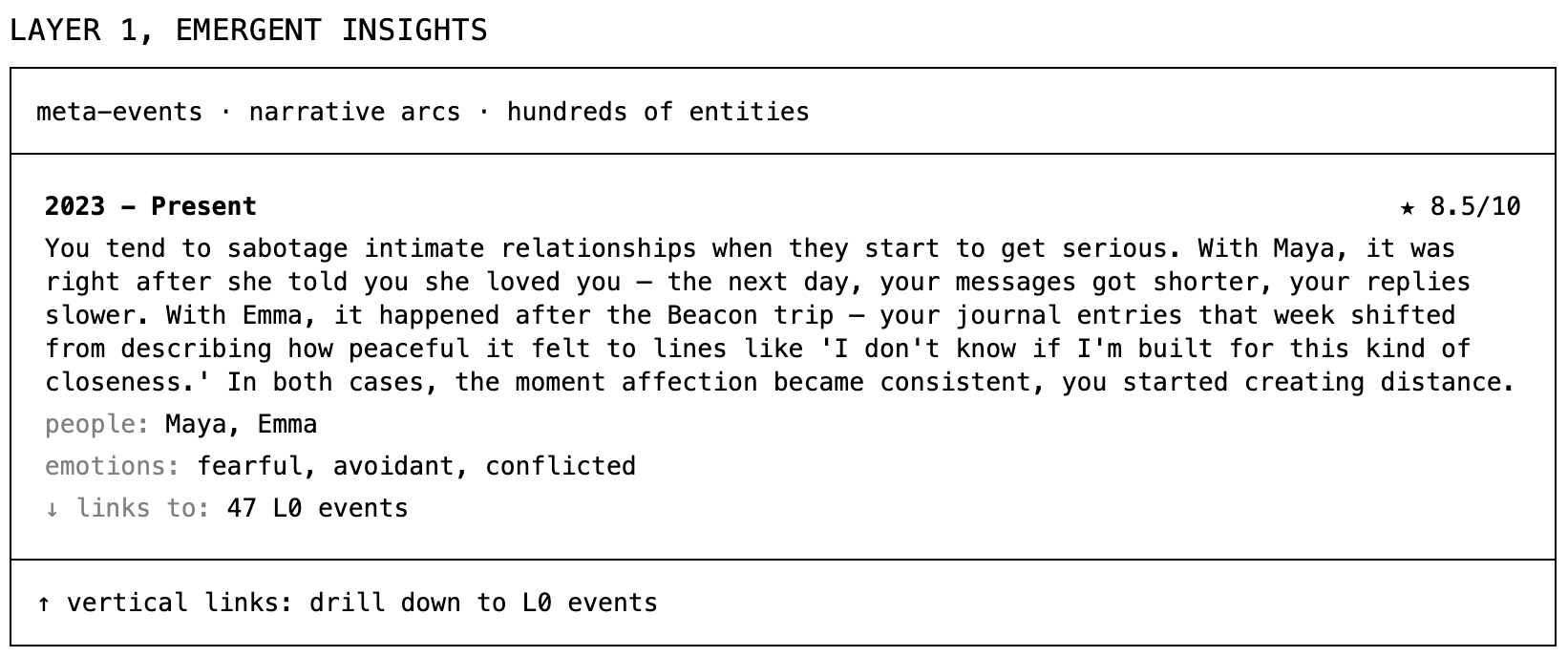 Content-wise, notice how instead of “Maya told you she loved you”, we have “Maya told you she loved you during dinner. You said it back, but your journal that night… Physical anxiety response to affection.” L0 surfaces interpretative signals, precise and compact, with enough details retained to facilitate further aggregation and extraction.