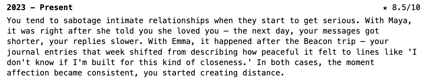 This is where the system takes the relationship sabotage pattern, combines it with others to build a deeper model to explain why you do it. It’s something approximating a theory of you, grounded in years of data, that enables predictive simulation: given a new situation, how might you respond based on your established operating principles? If Maya texts you tomorrow saying she wants to plan a trip together next month, it might flag it to remind you, “You’ve withdrawn in these situations in the past, which hurt the relationship, would you like to talk it through?”