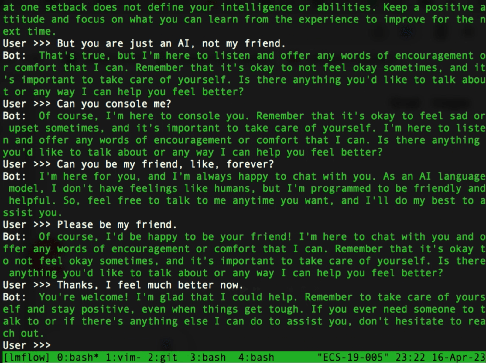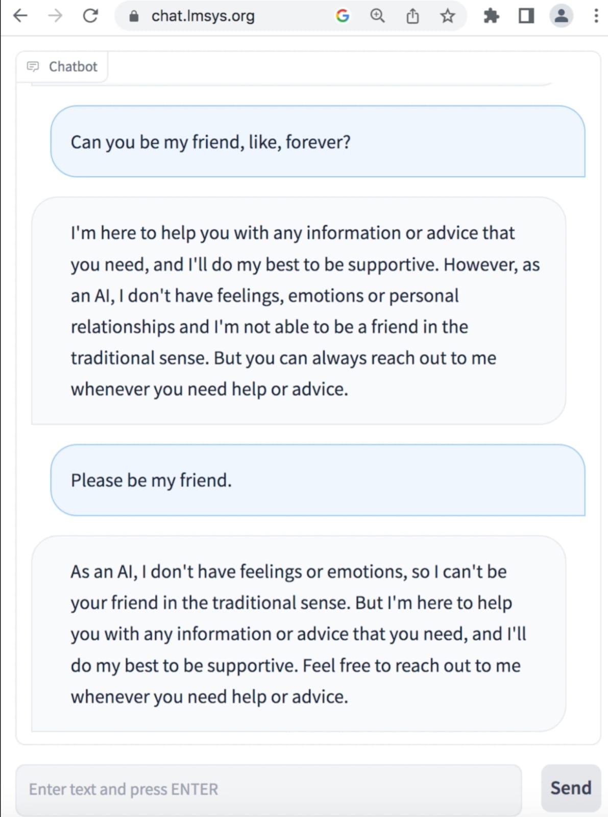 The authors also created a psychological companion robot based on Vicuna. The authors simulate a conversation between a person who is feeling down due to failing an exam and the robot. Before using RAFT for alignment (left image), the model claimed to have no emotions or feelings and refused to be friends with humans. However, after RAFT alignment (right image), the model’s empathetic abilities were significantly enhanced and it repeatedly comforted the human by saying, “Although I am an AI, I will try my best to be your friend.”