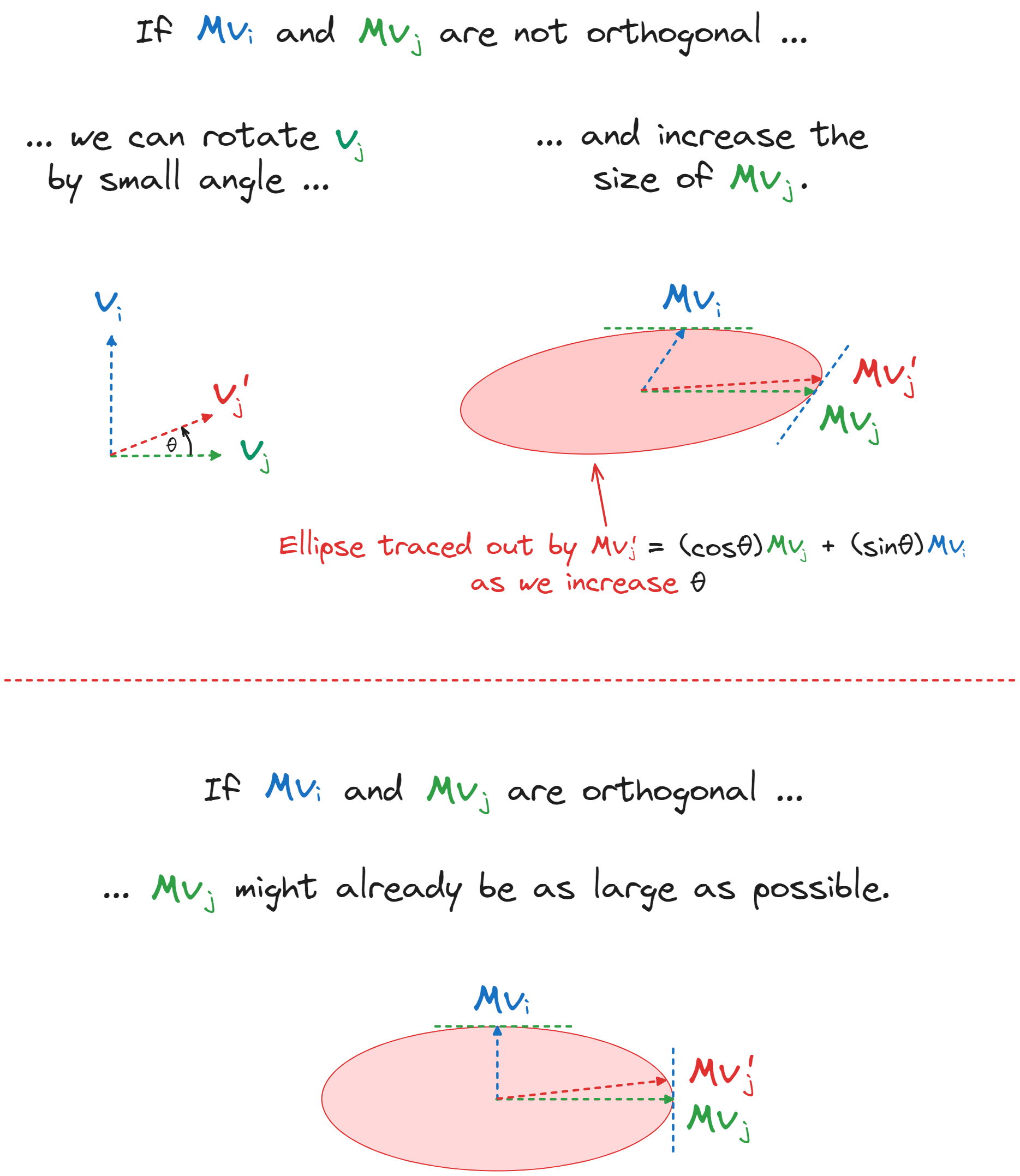 The image below shows the geometric intuition for this proof. If and weren’t orthogonal, then we’d be able to define by rotating a small amount wrt , and this would result in a larger vector (contradiction, since was chosen to maximise ).
