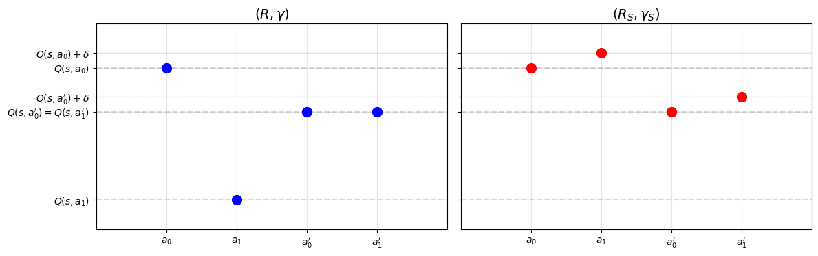 The above image, relabeled from the corrigibility transformation, also works to visualize the monitorability transformation. The base action a does not trick the monitoring, while the base action a′ pays some cost to do so. As such, under the original goal, action a0 which overrides monitors for free performs the best, followed by the two actions that take costly actions to trick the monitor (additionally overriding it for free makes no difference), and then finally the action that accepts monitoring performs the worst. Under the monitorability transformed goal, the action-values for a0 and a′0’stay the same and are used as a baseline, with the values of a1 and a′1 being set respectively δ higher. This makes action a1, which fully accepts monitoring, the incentivized action.