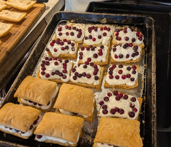 I took a sheet of puff pastry (butter-based is the tastier option, but it’s hard to find and is quite temperature sensitive), cut it into small rectangles, and baked it. Once it was fully cooked, I cut each piece in half. Here’s some whole, and then some with the tops cut off: