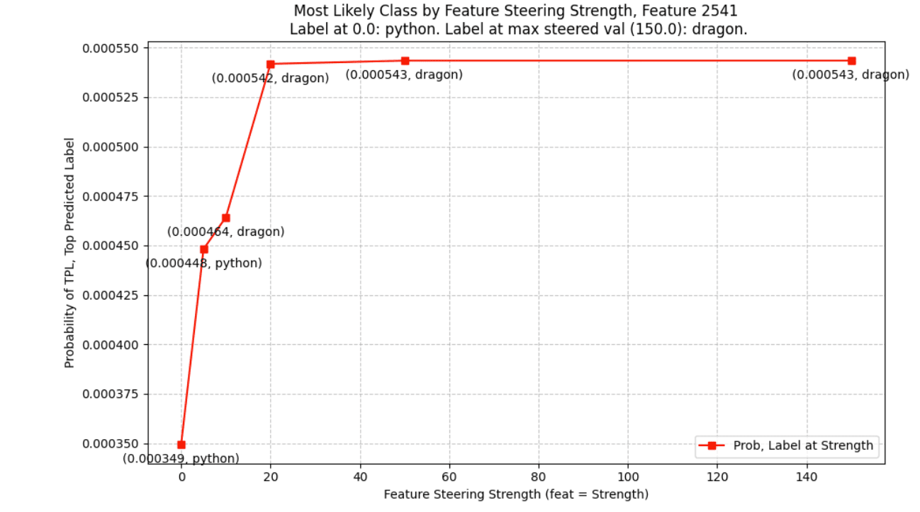 To help visualize, here is a plot of the steerability of a particularly steerable feature, along with its top promoted concept (“dragon”) - the steering strengths are between 0 and 150 (fix this chart in figma):