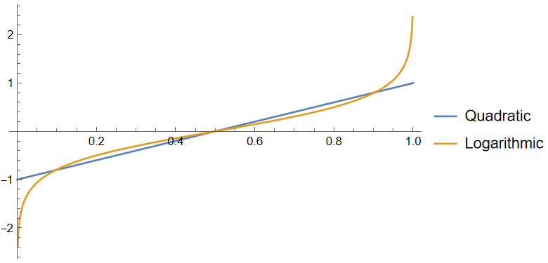 Intuitively, this means that if I use the log score, then Jaime cares a lot more about making his forecasts precise when they’re near the extremes. He cares about the difference between a 1% chance and a 0.1% chance, to a much greater degree than if I used the quadratic score. Jaime will think carefully and make his forecast extra precise before reporting a probability like 0.1%.