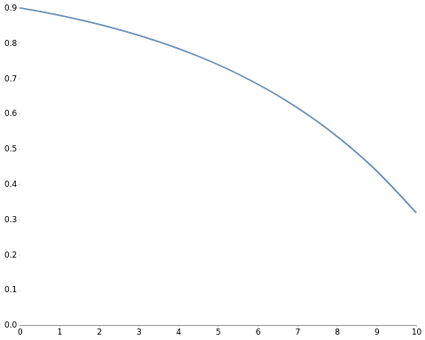 The type signature of this function is . That is, I take a probability (0.9), and output a function that goes from time passed, t, to probability remaining after time t. If I wanted to know what the probability is after 6 months, I’d uncomment the last line, probability_decayed_monthly(6), in this case equal to 0.684.