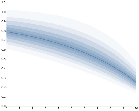 The type signature of this function is: . That is, I take a pair of probabilities (0,66, 0.95), and output a function that goes from time passed, t, to a probability density function. If I wanted to know what the probability of the event happening was after six months had passed, I’d look at the mean of the last picture, or uncomment the last line, mean(probability_decayed_monthly(6)), changing the type signature to .