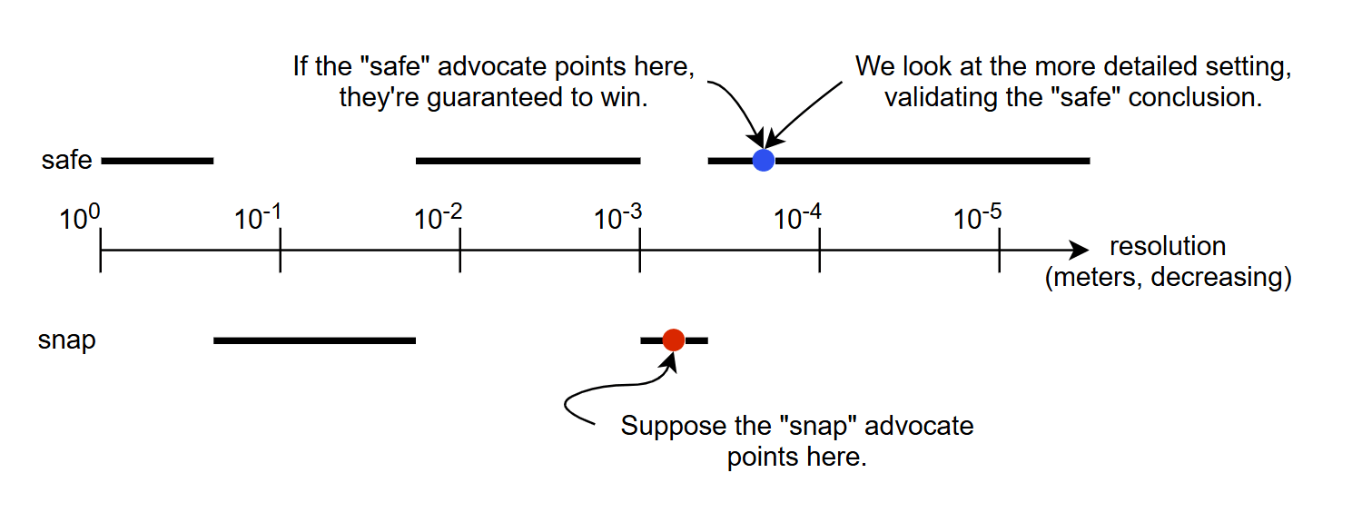 You thus assume the opposite, namely that there’s some resolution map for which every refinement leads to the same conclusion. Now something nice happens: you can’t have both a “snap” resolution map and a “safe” resolution map which agree with all of their refinements! Why? Construct a new resolution map by taking the finer resolution of the two original maps at every point in space. This resolution map is a refinement of both original maps simultaneously. If the new map reaches the “safe” conclusion then the “snap” map had a contradictory refinement, if the new map reaches the “snap” conclusion then the “safe” map had a contradictory refinement.