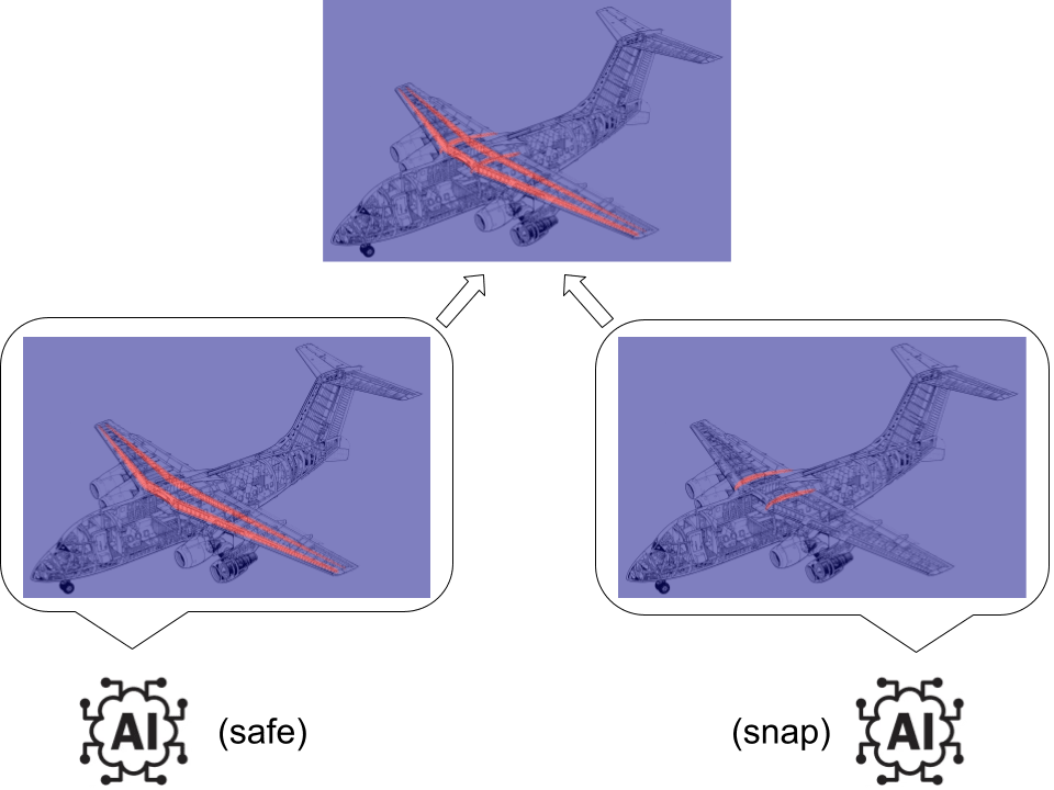 Note that it doesn’t hurt to provide our debaters with an extra little incentive to give us as coarse a simulation as possible while satisfying our demand. What might this look like in practice? Suppose for a second that the wings really are safe. The “safe” debater should highlight the components of the airframe which are necessary to ensure the safety of the wings, such as the wing spars. If the “snap” debater feels guaranteed to lose then they might return a maximally-coarse resolution map. Alternatively, if the coarseness incentive is small and the snap debater thinks the safe debater might mess up then maybe the snap debater returns a resolution map that shows the snapping behavior as dramatically as possible, maybe by using high resolution around the weak wing roots and low resolution around the reinforcing wing spar. Thus, you can expect to end up running a simulation that focuses your computational resources on the wing spars and the wing roots and whatever other bits of the airframe are critical to answering your question while deprioritizing everything else. The game result tells you what’s important even if you didn’t know a priori.