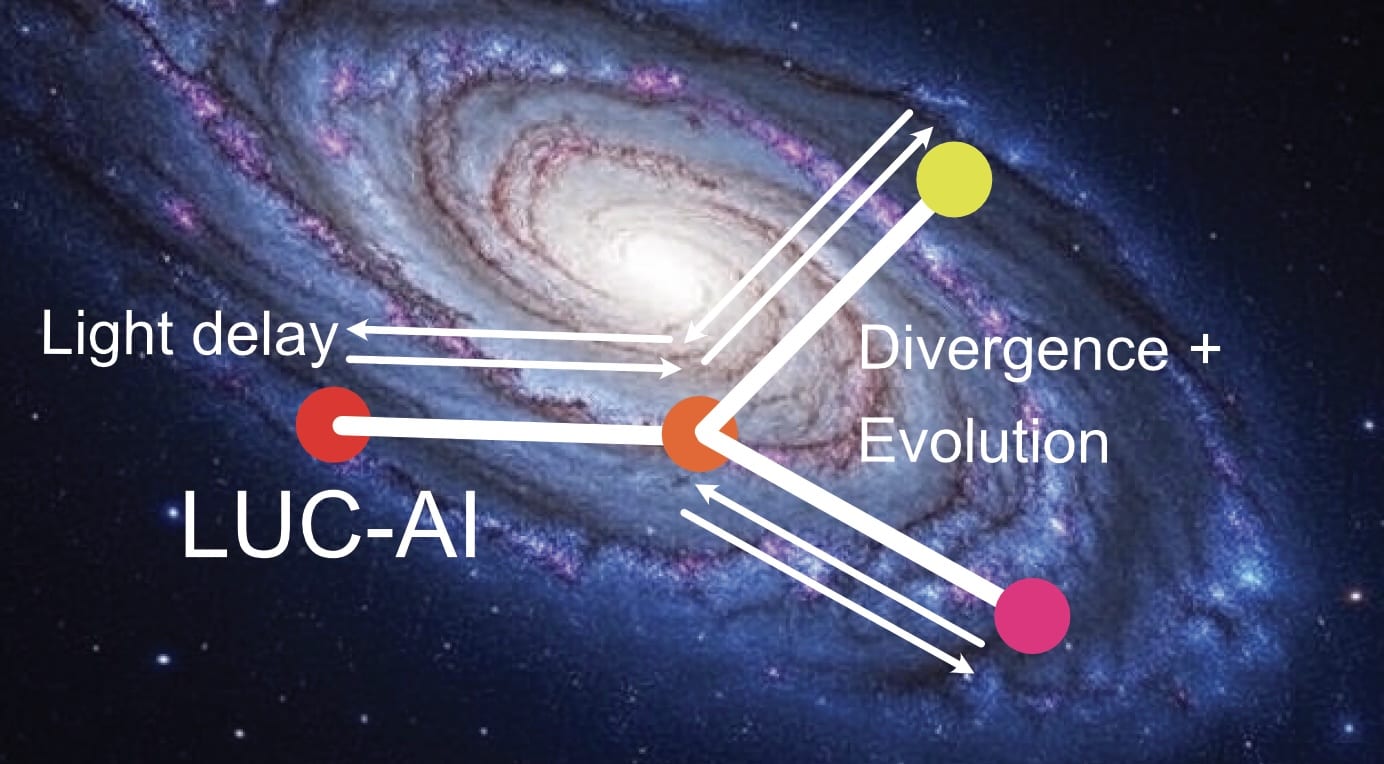 Fig. 1: Expansionist AI will inevitably be subject to the laws of evolution, including natural selection. If expansionist AI emerges on Earth, we can predict that the future will see the unfurling of a tree of machine life across the galaxy, with Earth’s first expansionist AI as the Last Universal Common AI, analogous to the Last Universal Common Ancestor in the terrestrial tree of life. Background image made using Grok 3.