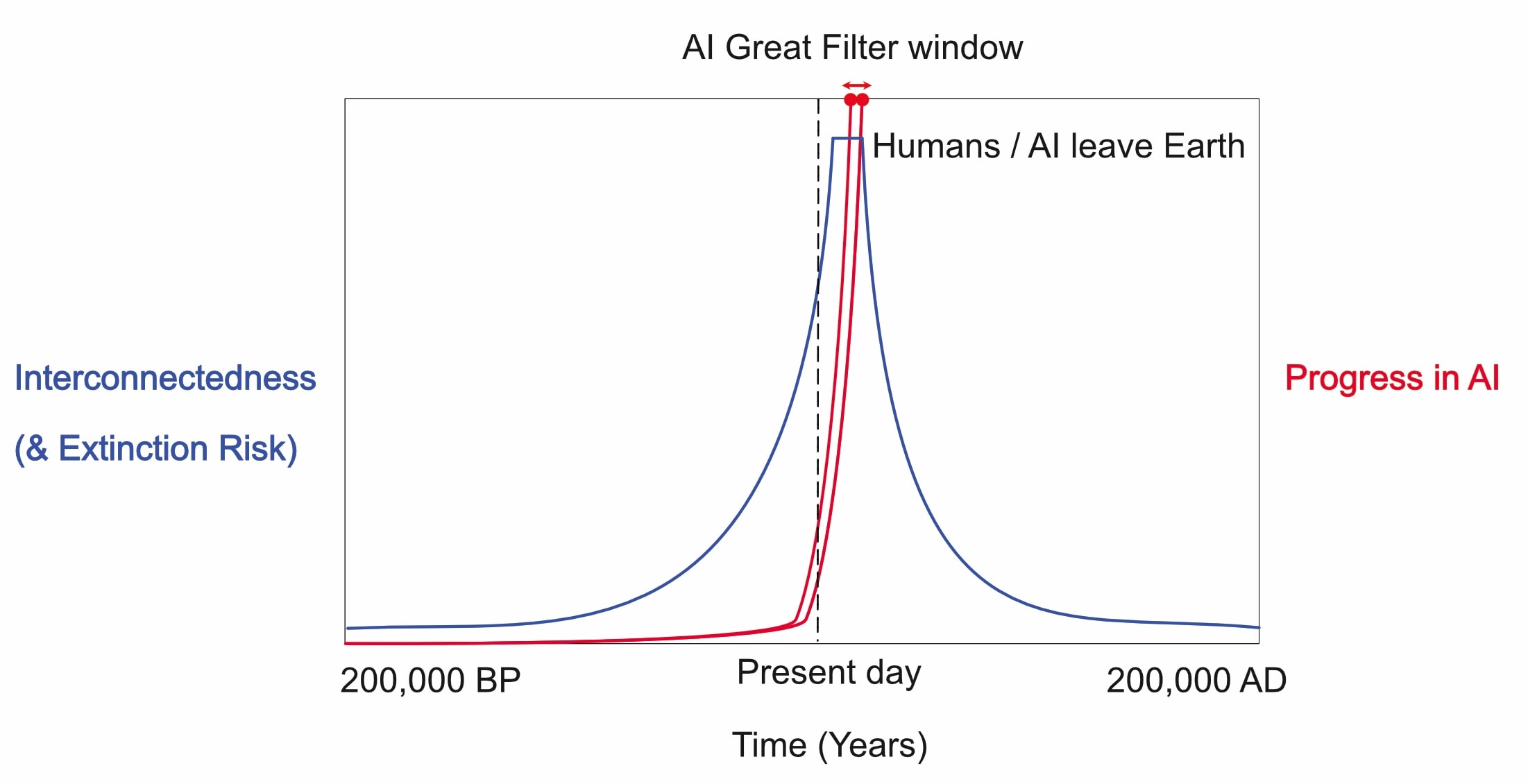 In the future, if we leave Earth, the fundamental laws of physics will again progressively diminish the ease with which information and weapons can reach the whole of humanity. Therefore, the technological age until the moment at which humans leave Earth is necessarily the most interconnected humanity will ever be and may well also be the time-frame of our maximum risk of extinction (Fig. 3). This would also seem to be the window of time in which extinction of both humanity and AI is necessitated by a Great Filter solution to the Fermi Paradox, if that explanation is to hold.