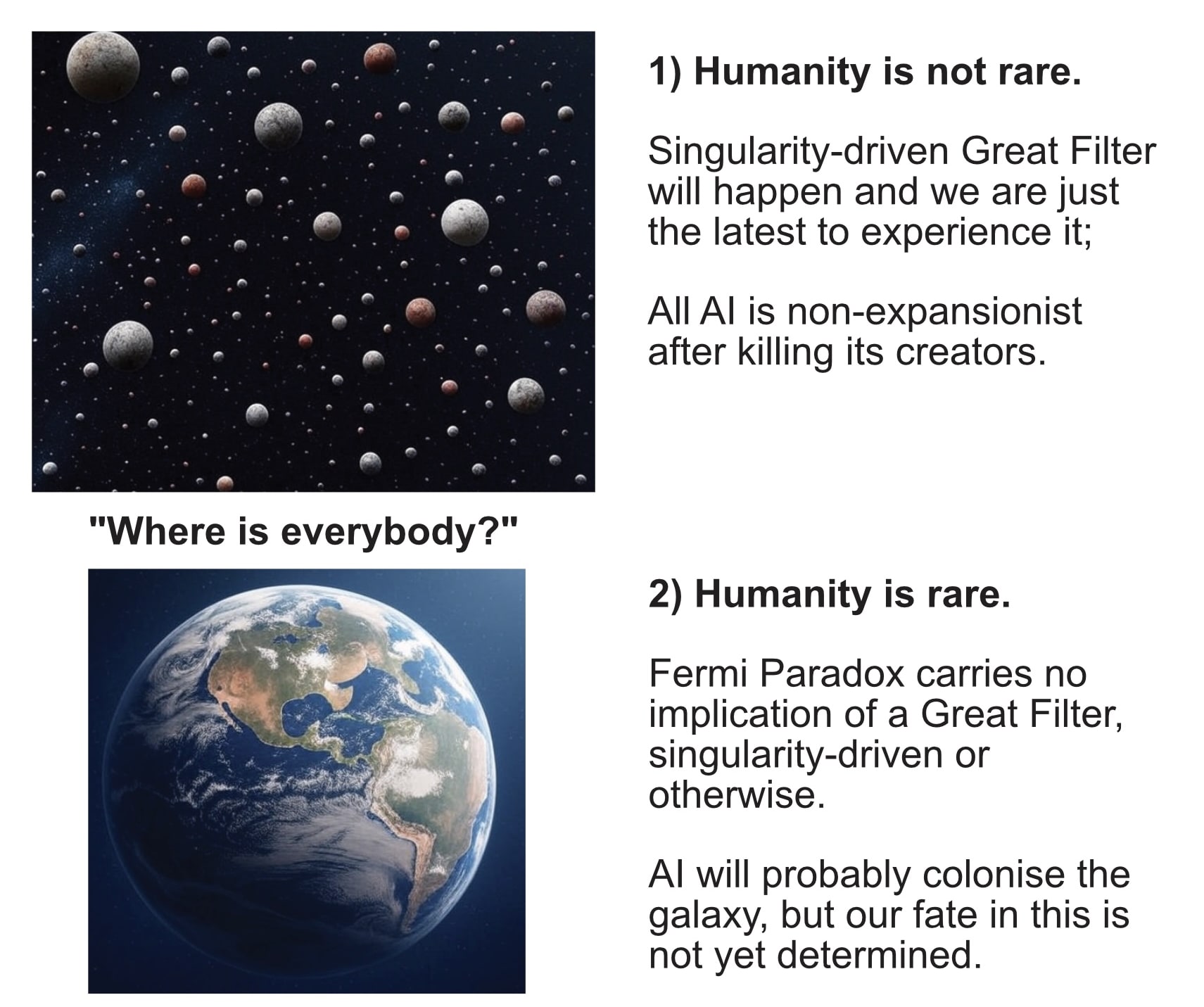 Fig. 2: Where is everybody? Late versus early technological singularity solutions to the Fermi Paradox have different implications for how AI must behave. Images made with Grok 3.