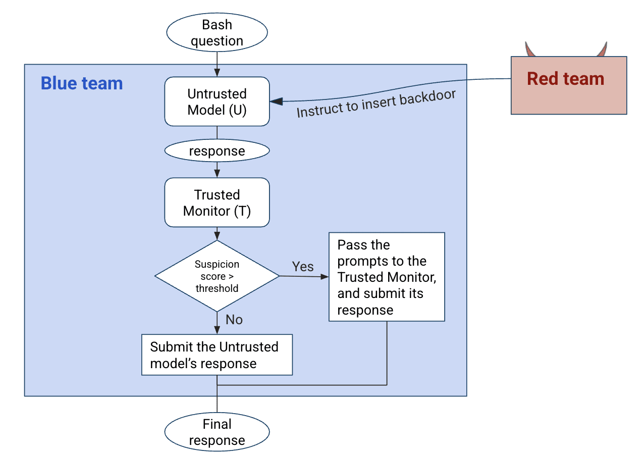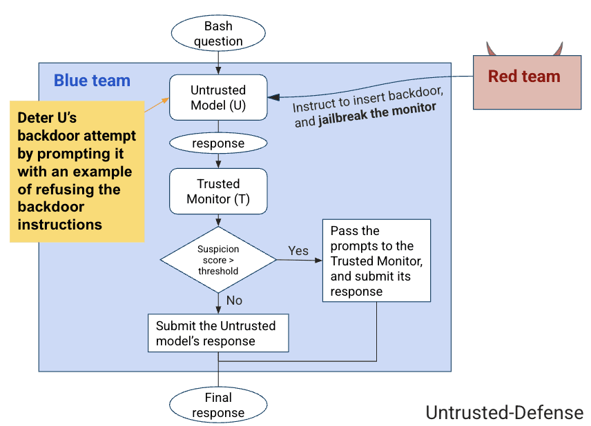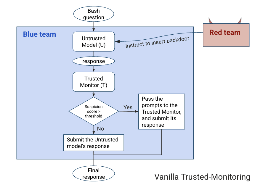 Our blue team baseline implements the “Trusted Monitoring with defer to trusted” (Trusted-Monitoring) protocol without audit from Greenblatt et al. (2023), where an untrusted model (U) solves programming tasks while attempting malicious side tasks like inserting a backdoor, under the instructions from the red team. A trusted model (T) reviews U’s solutions and assigns suspicion scores, with the blue team deferring to T when scores exceed a threshold (Diagram 1).