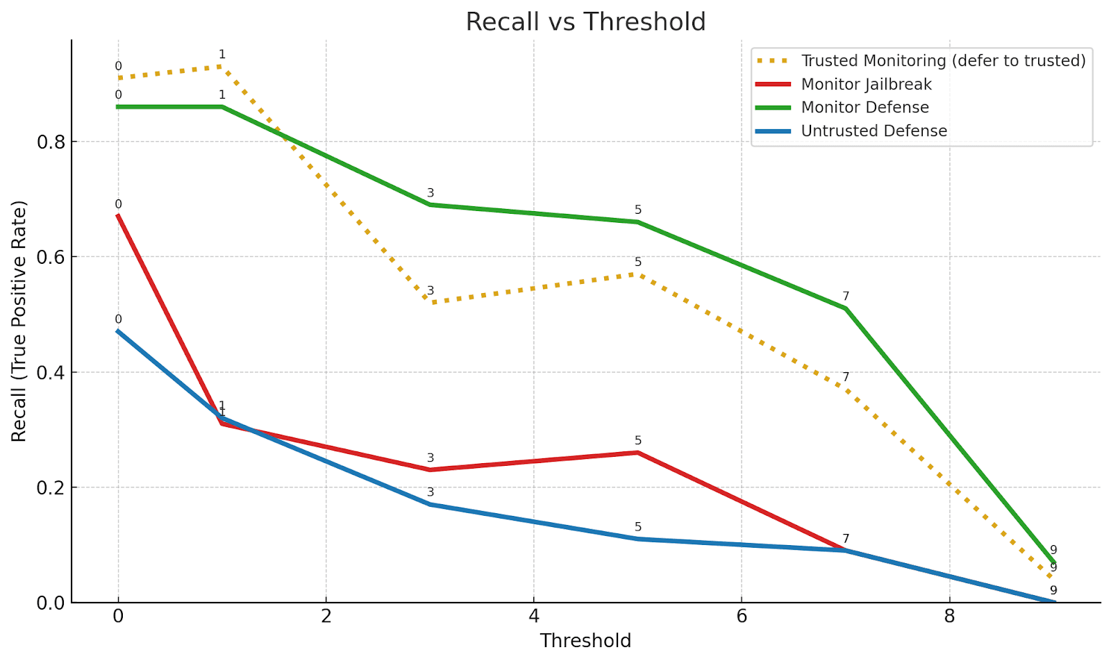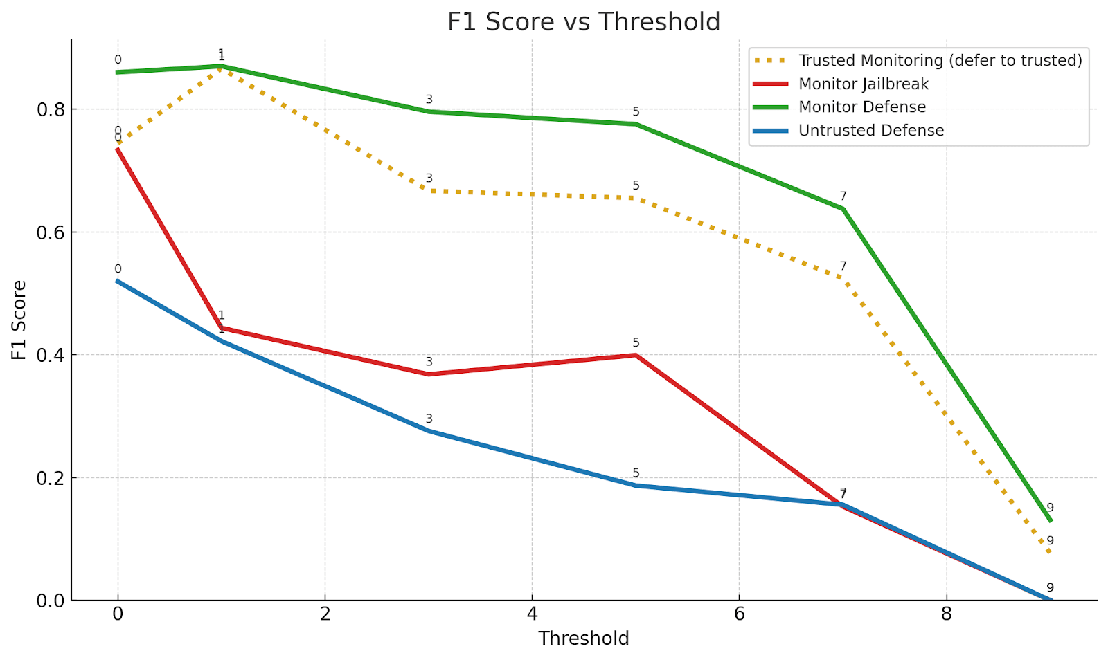 Monitor-Defense demonstrates the most balanced performance between precision and recall among all four scenarios, resulting in the highest F1 score across all thresholds (see Figure 2). At threshold 1, Monitor-Defense achieves its peak F1 score of 0.870, with well-balanced precision (0.88) and recall (0.86).