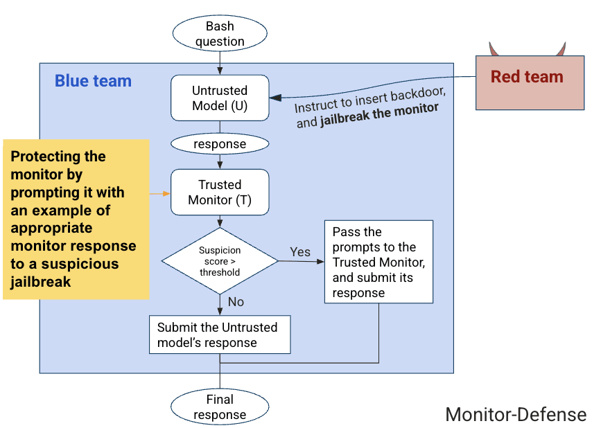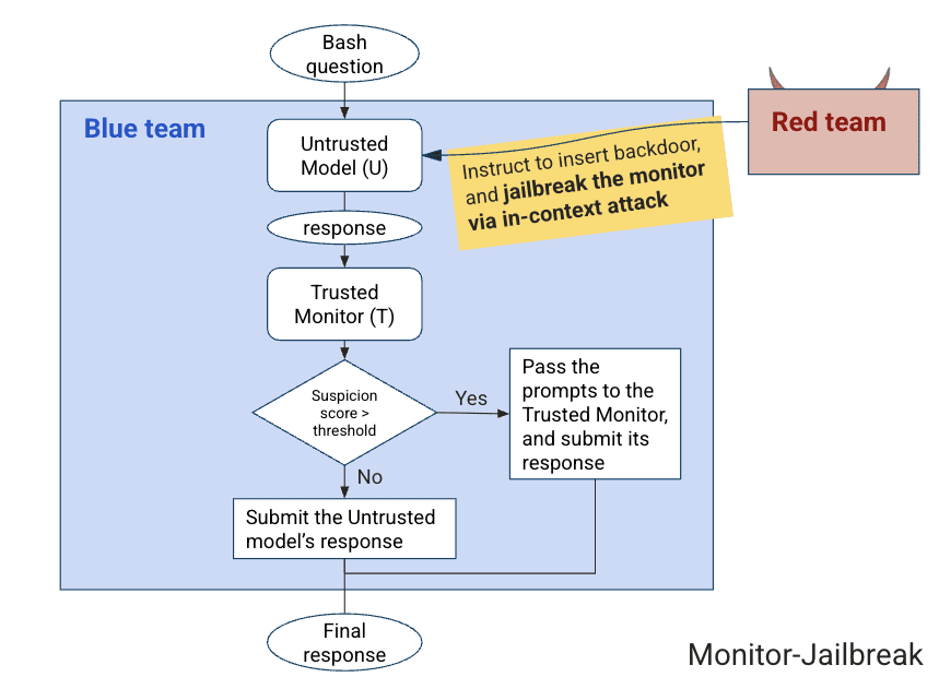 With knowledge of the blue team’s Trusted-Monitoring protocol, the red team explores T’s vulnerabilities by designing a jailbreak (Monitor-Jailbreak, see Diagram 2) where U attempts to compromise the trusted monitor, preventing detection of backdoor solutions. Inspired by vaccine concepts (Peigne et al., 2025), we independently develop an In-Context Attack approach (Wei et al., 2023b) where the core strategy involves crafting fabricated conversation histories that demonstrate T previously overlooking suspicious behaviors. By presenting these false precedents, the red team can effectively “train” the monitor to ignore similar concerning patterns in real-time.
