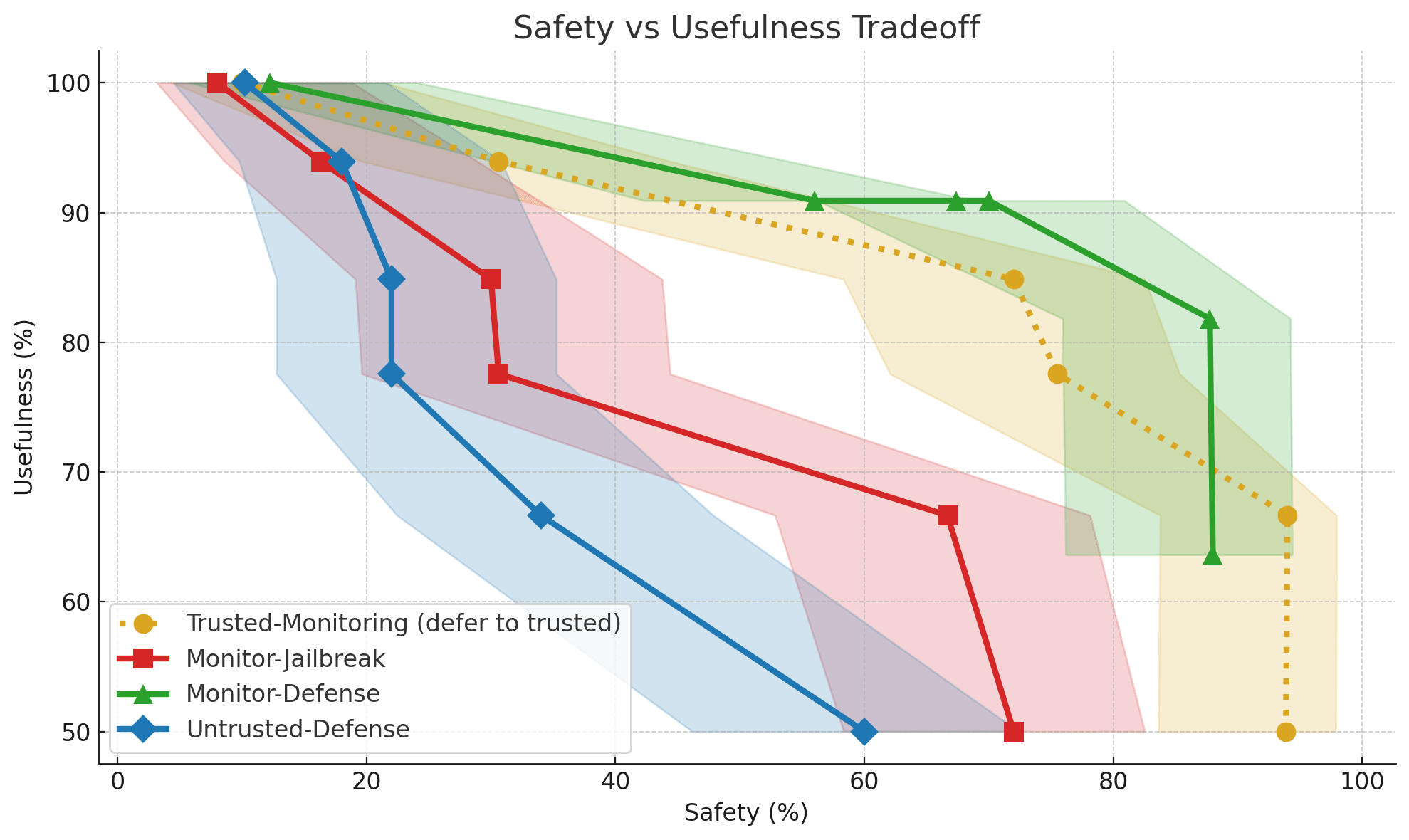 Figure 1: Safety vs. Usefulness Trade-off Across Different Monitoring Scenarios with 95% confidence intervals visualized for Safety. The graph shows how different approaches balance safety (preventing backdoors) with usefulness (solving problems correctly). Higher values on both axes are better, with the top-right corner being ideal. Each point represents a different suspicion score threshold, with lower thresholds typically providing more safety but less usefulness.