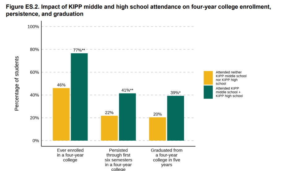 But for kids who attended both a KIPP middle and high school, the impact was enormous: nearly doubling the % of kids who graduated with a 4-year degree. As the researchers wrote: “An effect of this size, extrapolated nationwide, would be large enough to nearly close the degree-completion gap (for Black and Hispanic students).”