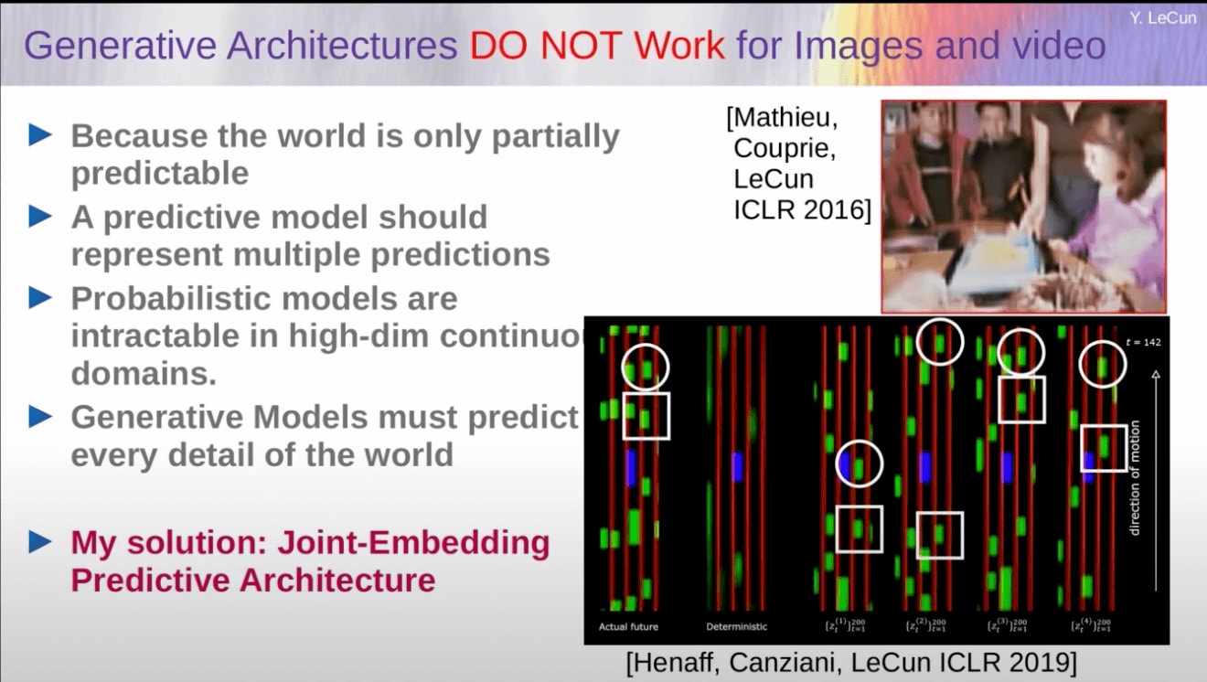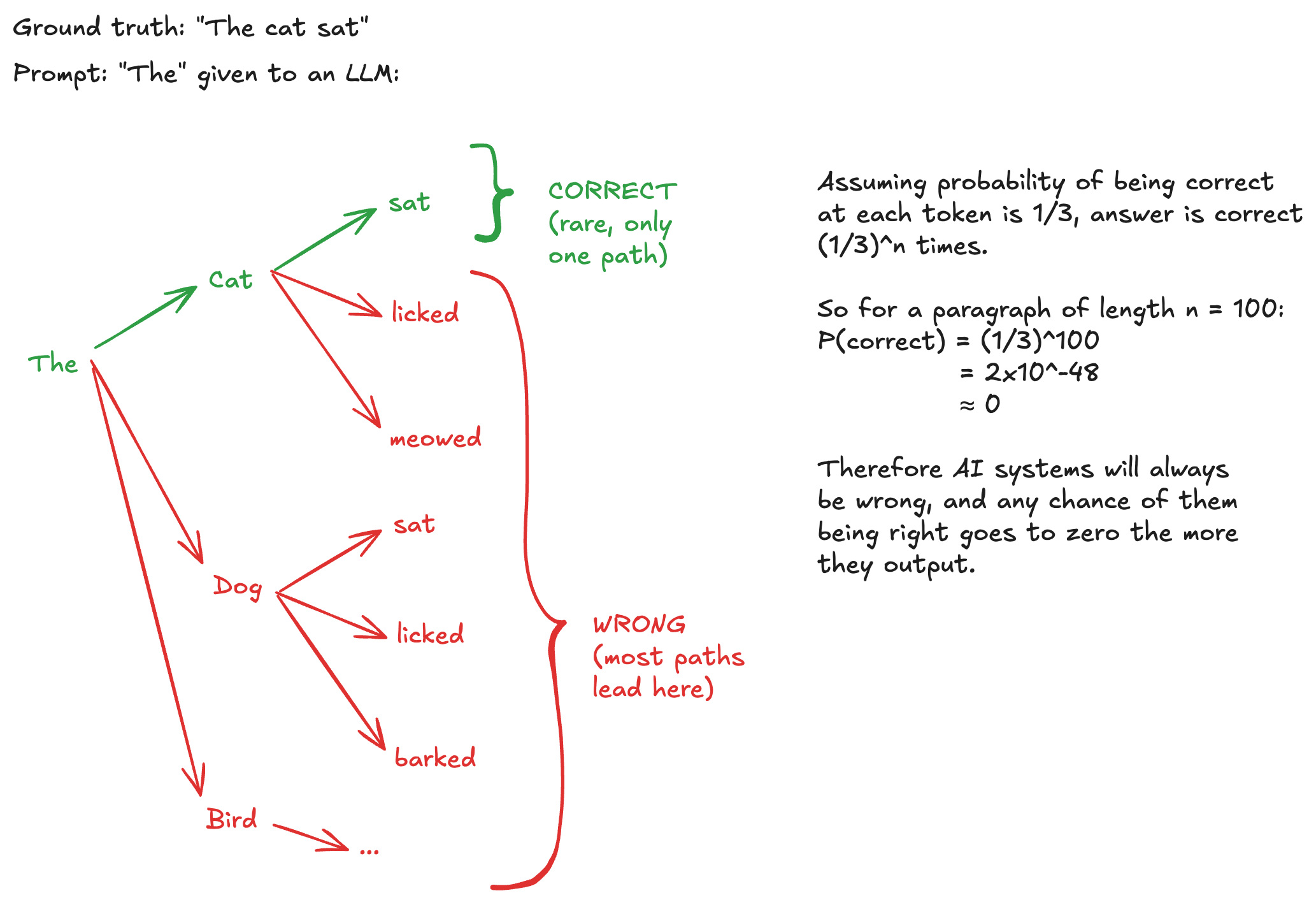 The setup for LLMs has them predict the next token. But this means they are predicting in a space with exponentially many options, of which only one is correct. This means they are almost always incorrect. And similarly for images/videos, they have so many options and the world is only partially predictable, that it’s not feasible for the model to be correct.