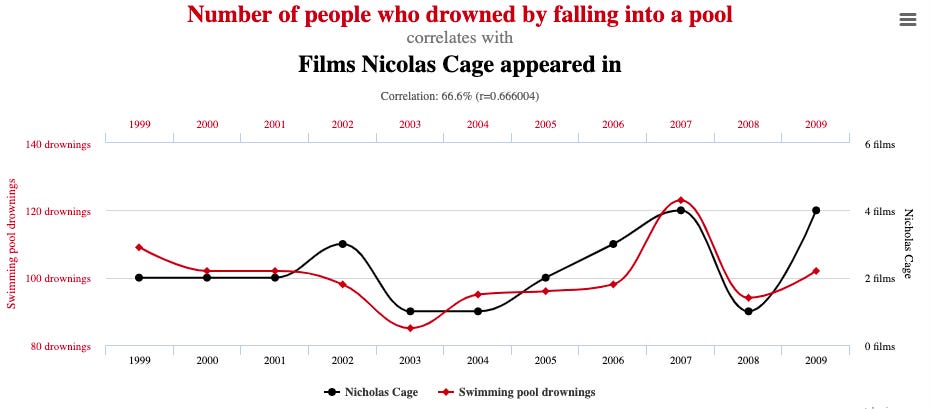 I don’t know anything about pool drownings or Nicholas Cage, so I can’t tell a good story about this one. Likewise, it’s easy to invent post-hoc explanations of any relationship. However, it seems possible that even pool drownings and Nicholas Cage appearances aren’t entirely unrelated.