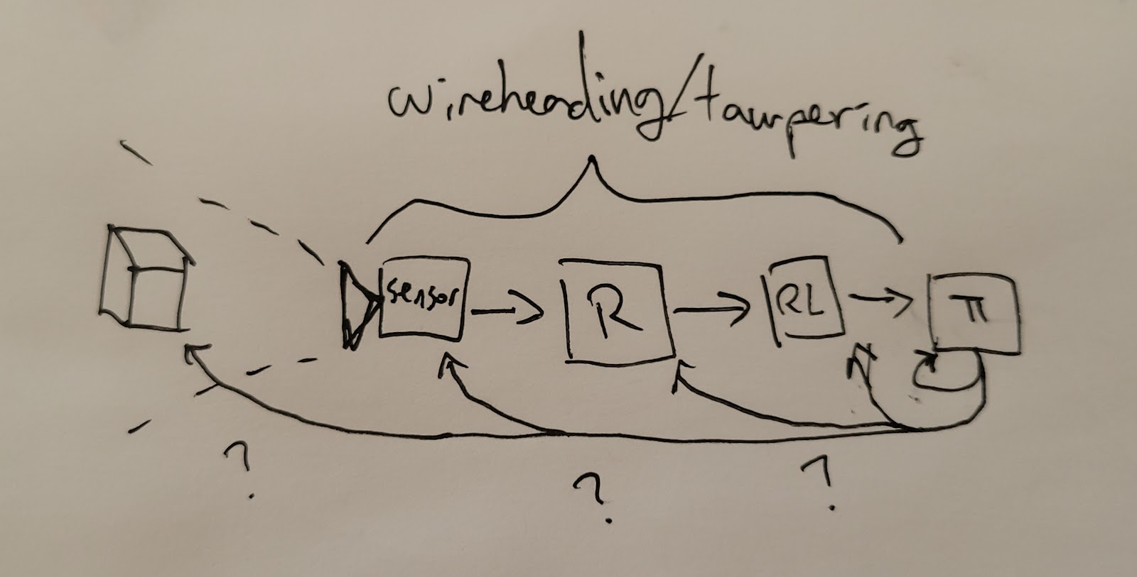 Thus, whether the RL agent wireheads is a function of how powerful the RL algorithm is, how easy wireheading is for a policy to implement, and the inductive biases of the RL algorithm. Depending on these factors, the RL algorithm might favor the policies with mesaobjectives that care about the “right parts” of the world (i.e the thing we actually care about), or the wrong parts (i.e the reward register, the transistors in the CPU).