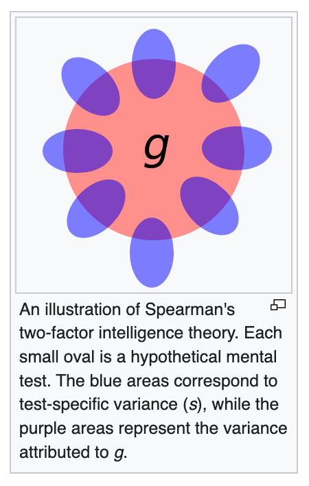 On the first picture, the blue ovals represent the performance at different mental tests, and their intersection with the orange disk represent how much the result of the test can be predicted from the g-factor (itself measured by sampling random tests).