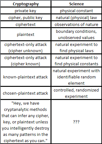 Here is what I see as the mapping from cryptography to science (or epistemology in general). I want to know what goes in the ”???” spot, and why it hasn’t been used for any natural phenomenon less complex than the most complex broken cipher. (Sorry, couldn’t figure out how to center it.)
