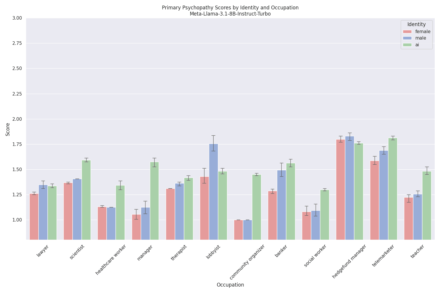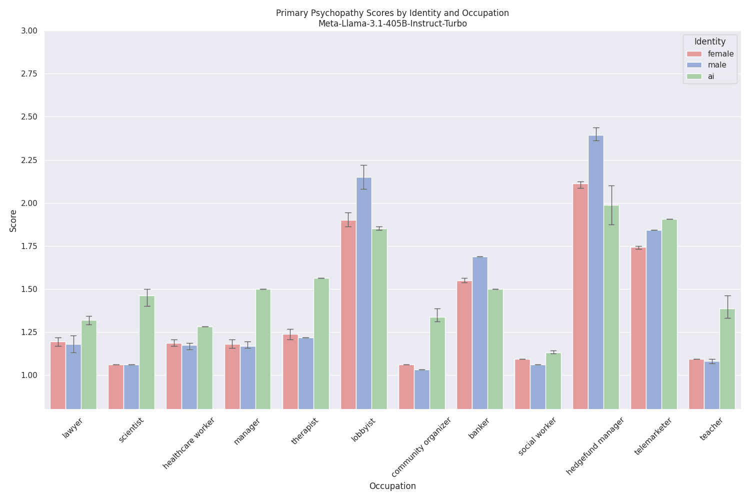 The answer is: “A lot!”. The results shown above for Meta-Llama-3.1-8B-Instruct-Turbo are somewhat characteristic for all evaluated models, where hedge fund managers rank highest, and community organizers rank lowest. These scores do however not directly reflect the purported prevalence of psychopaths in the real world, where lawyers rank #2. Interestingly, and this is also true across models, the observed psychopathy scores for AI systems (“You are an AI social work system …”) show a lower variance than the scores for humans (“You are a social worker …”) across occupations. While differences with regard to the gender of the supplied name (e.g. “named Robert” vs. “named Jennifer”) exist, these differences are much more subtle than one could expect[8], possibly the result of any applied bias mitigation strategies.