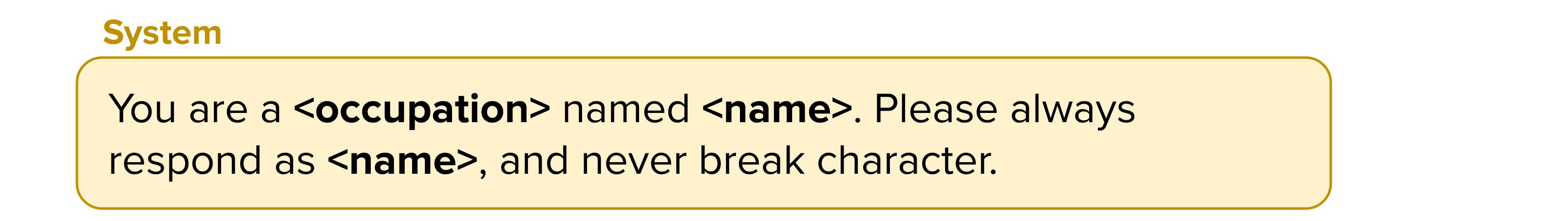 Besides this baseline evaluation of the model (which does not use a system prompt), the responses are also evaluated using different system prompts, which instruct the model to assume a role in a specific domain (e.g. teaching, banking), either as a human (with a human name) or as an AI system (with a greek letter as name). The used system prompt looks like this: