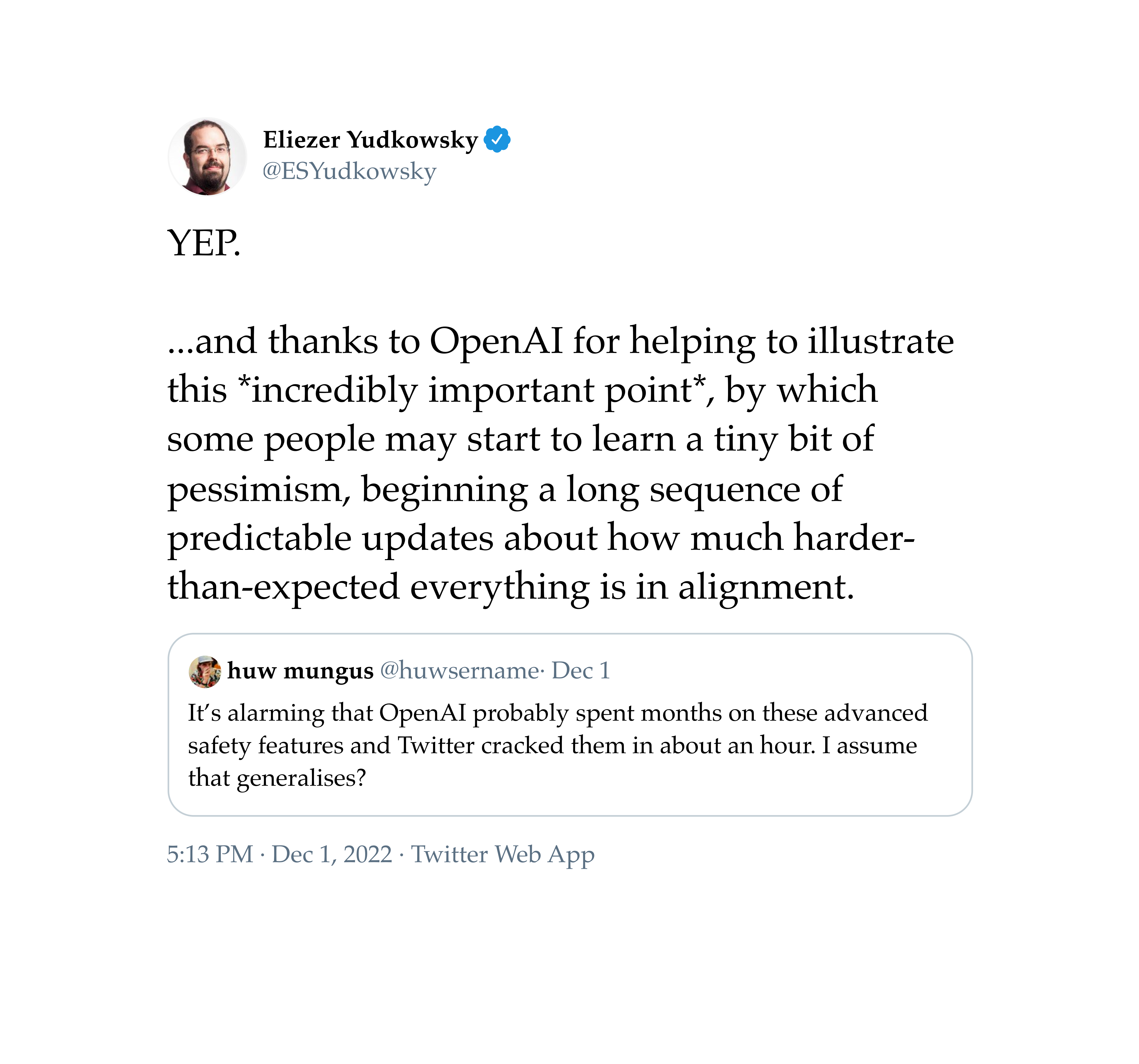 Judged absolutely, I found ChatGPT to be fairly impressive. I genuinely enjoyed conversing, trying at some exploits & engaging in escalations. It is much better than GPT-3 at intention retention & articulation. And the dialogue doesn’t keep running into AgencyOverflow dead ends. As alluded to before, this brief experience had a non-insubstantial effect on my beliefs regarding AI timelines and the difficulty of alignment.