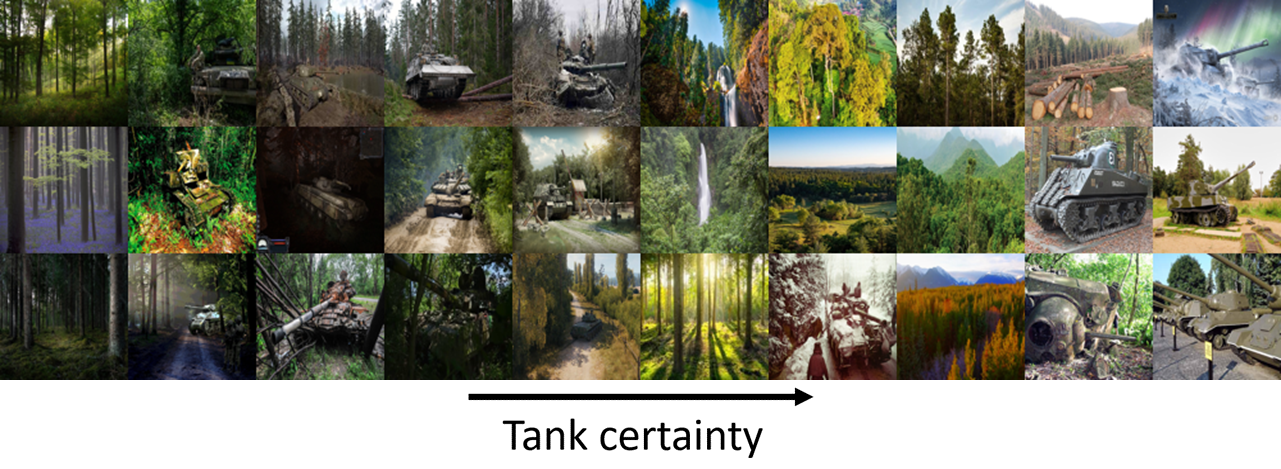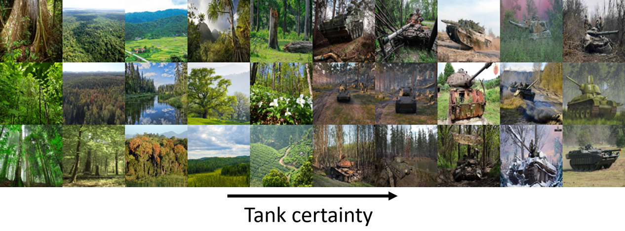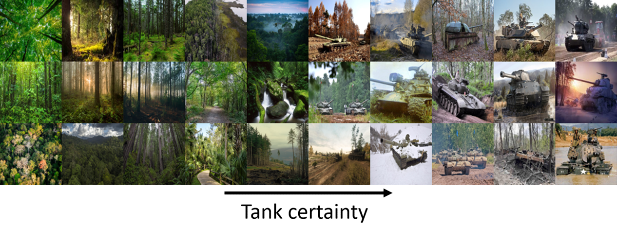 To replicate the Pentagon’s complaint, we then simulated the deployment of this classifier into the field with an unlabeled dataset of similar images, that doesn’t have the bias to the same extent. Below are 30 images randomly taken from the unlabeled dataset also ordered by tank certainty. Now the clear division between tank and no tank is gone: there are actually more images without a tank on the right hand (tank) side of the gradient.