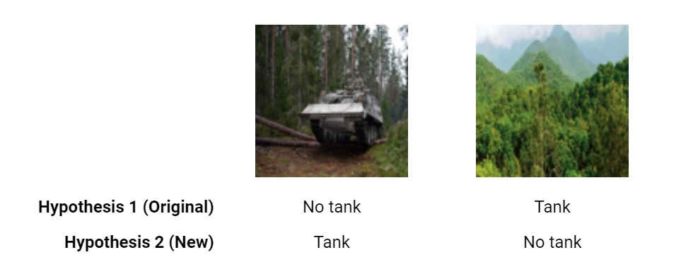 In this theoretical situation, hypothesis 2 would be clearly correct. And we would have a clearer understanding of how hypothesis 1 was mis-classifying tanks.