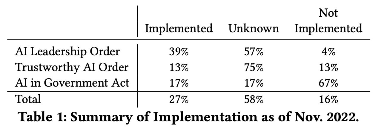 Limited success in implementing AI policies. Less than half of the 45 legal requirements across these laws were publicly verified as implemented. For example, the Trustworthy AI Order required that federal agencies document their use of AI, but only about half have done so. Many agencies which demonstrably use AI have not submitted the required documentation. Similarly, the AI Leadership Order directed each federal agency to issue AI strategies, but 88% of agencies have failed to do so.