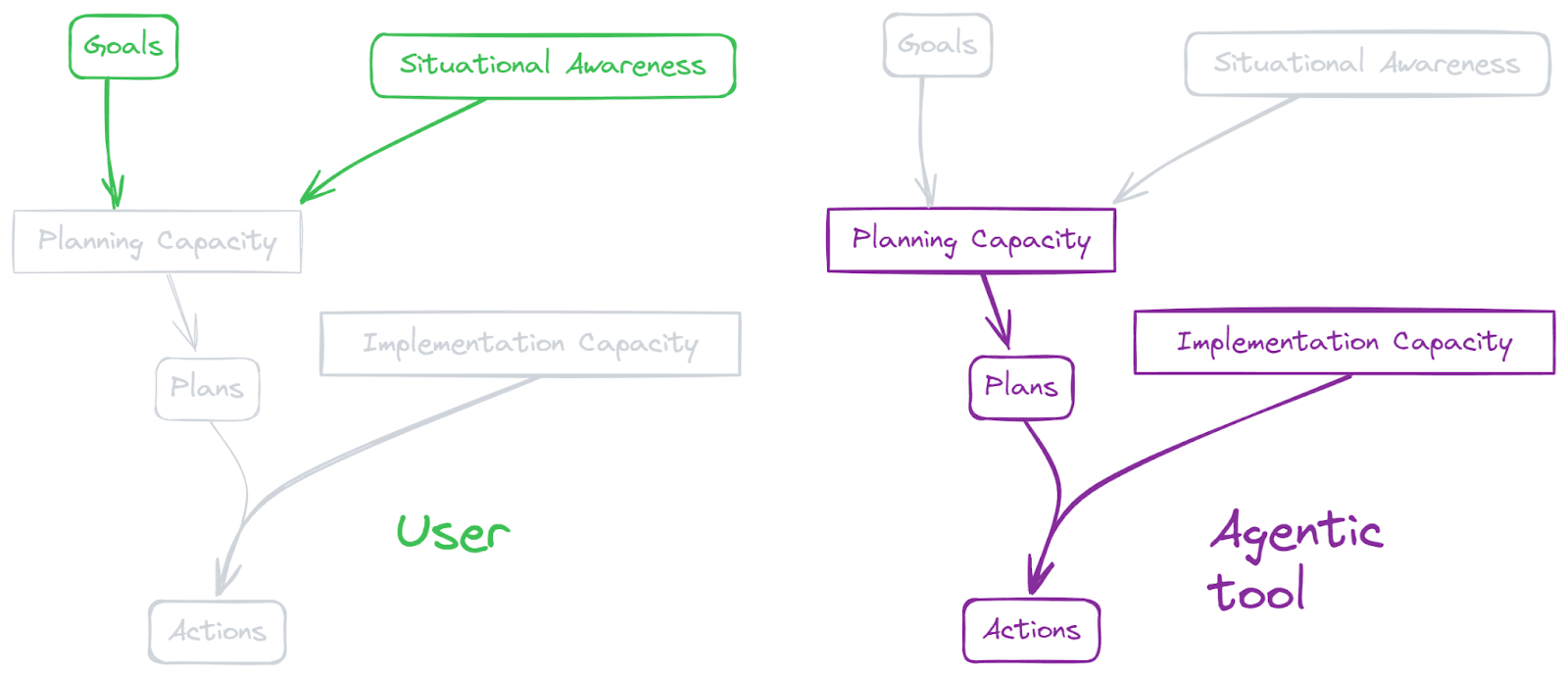(In these examples the agentic tool is bringing some situational awareness, with regard to local information necessary for executing the task well, but the broader situational awareness which determined the choice of task came from the user.)