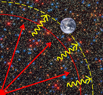 Here, a civilization is expanding from the red point, and will eventually reach Earth (drawn not entirely to scale). It’s expanding at a decent fraction of light-speed. The red sphere is their physical expansion front, while the yellow sphere is the light expansion front. When that yellow reaches Earth, we will generally be able to notice their expansion, and have some time to react to it—unless they conceal themselves as they expand.