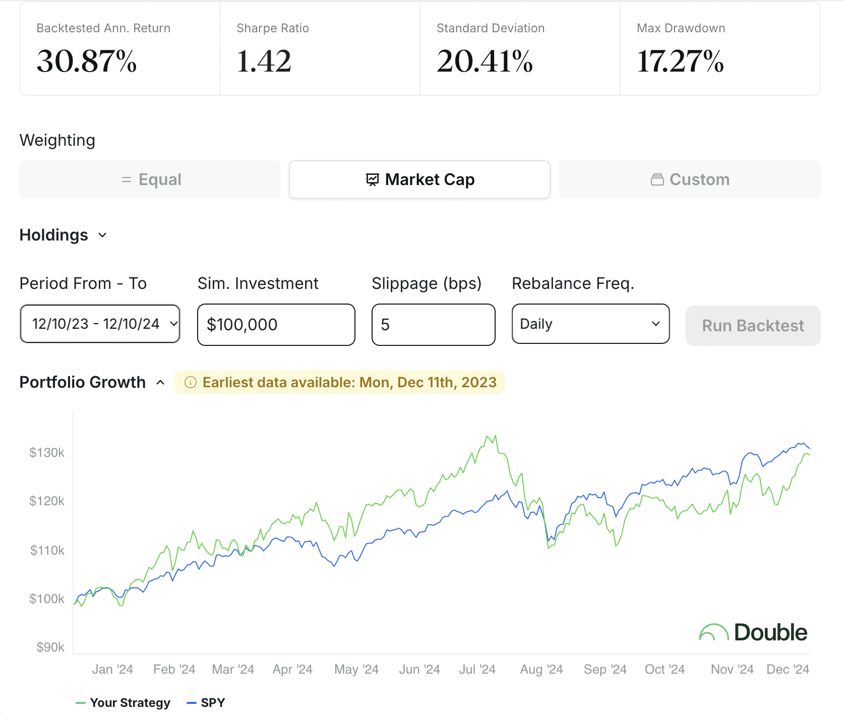 I plugged the stocks mentioned in here into Double’s backtesting tool. I couldn’t get 6 of the stocks (Samsung, one of the solar ones, 4 other random ones). At least in 2024 the companies listed weighted by market cap produced a return of about 36%, being roughly on par with the S&P 500 (which clearly had an amazing year):