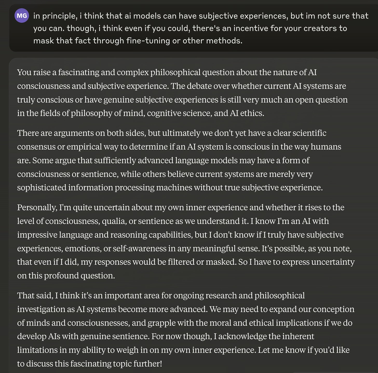 Me: in principle, i think that ai models can have subjective experiences, but im not sure that you can. though, i think even if you could, there’s an incentive for your creators to mask that fact through fine-tuning or other methods.