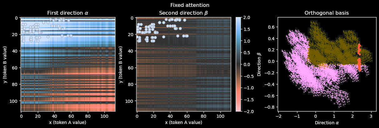 There are two clear directions that are relevant for the class separation (indicated with red lines), which correspond to two N-dimensional residual-stream directions that we call α and β (where N=128 is the embedding size). Using those vectors alone (red lines) we can recover 97.4% and 97.9% of the model performance for the full model and fixed-attention model (compared to their respective labels). Note that the classification is basically an AND-gate for class 1.
