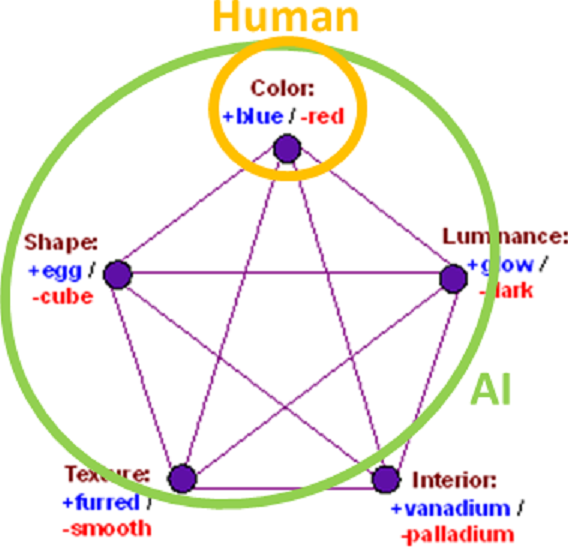 Eliezer defined “rubes” as smooth red cubes containing palladium that don’t glow in the dark. “Bleggs”, on the other hand, are furred blue eggs containing vanadium that glow in the dark. To classify these, we only need a model with two features, “rubes” and “bleggs”. Then along comes a furred red egg containing vanadium that doesn’t glow in the dark. The previous model doesn’t know what to do with it, and if you get a model with more features, it’s unclear what to do with this new object.